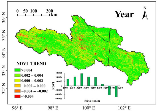 A pixel-by-pixel analysis was conducted to examine the vegetation change trends in the source region of the Yellow River and to explore the responses of vegetation to climate change. The results indicate that from 1998 to 2018, vegetation growth improved in 92.7% of the study area, while localized regions experienced vegetation degradation (Figure 4, Equation (2)), accounting for 7.27% of the total area. The degraded areas were primarily distributed in regions with higher population densities. The spatial distribution of annual NDVI exhibited significant regional differences, generally decreasing from the southeast to the northwest, which aligns with the spatial patterns of climate and elevation. Notably, the greatest vegetation increase occurred in areas with elevations of 3250–3750 m, whereas vegetation decline was mainly concentrated in regions with elevations of 5250–6250 m.