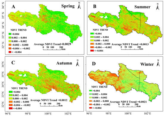 Seasonal vegetation trends (NDVI units per year) in the source region of the Yellow River from 1998 to 2018. (A) Spring, (B) Summer, (C) Autumn, (D) Winter. The average NDVI trend for each season is indicated below the corresponding subfigure.