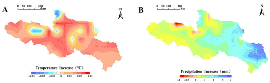 It is widely recognized that vegetation growth is directly influenced by climatic variability. In the source region of the Yellow River, both temperature and precipitation exhibited overall increasing trends during 1998–2018, but with pronounced spatial heterogeneity. Temperature rose significantly across most areas (92.8%), with the most pronounced warming observed in the central and eastern parts, where the rate of increase exceeded 0.35 °C per decade (Figure 6A, Equation (2)). In contrast, localized cooling trends were detected in some northern and western areas. Precipitation also showed an overall increasing trend (97.1% of the region), with the eastern and southern parts experiencing the largest increases, up to 3 mm/year (Figure 6B, Equation (2)). However, localized decreases were observed in the western and, particularly, the northwestern parts of the study area.