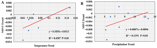 Relationships between NDVI trends and climatic trends at meteorological stations. (A) Correlation between NDVI trends and temperature trends. (B) Correlation between NDVI trends and precipitation trends. (A) Correlation between the NDVI trend slope and the temperature trend slope. (B) Correlation between the NDVI trend slope and the precipitation trend slope. Each data point represents one meteorological station. The R2 and p-value indicate how well the spatial variation in climate trends explains the spatial variation in vegetation trends across the stations.