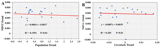 Correlation Between Normalized Difference Vegetation Index (NDVI) Trends and Population (A)/Livestock (B) Trends at the County Level from 1998 to 2018.