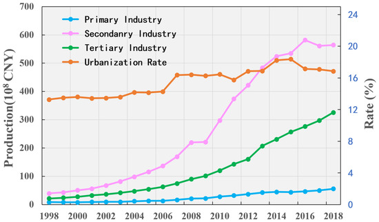 Output of the Three Major Industries and Urbanization Rate in the Source Region of the Yellow River from 1998 to 2018.
