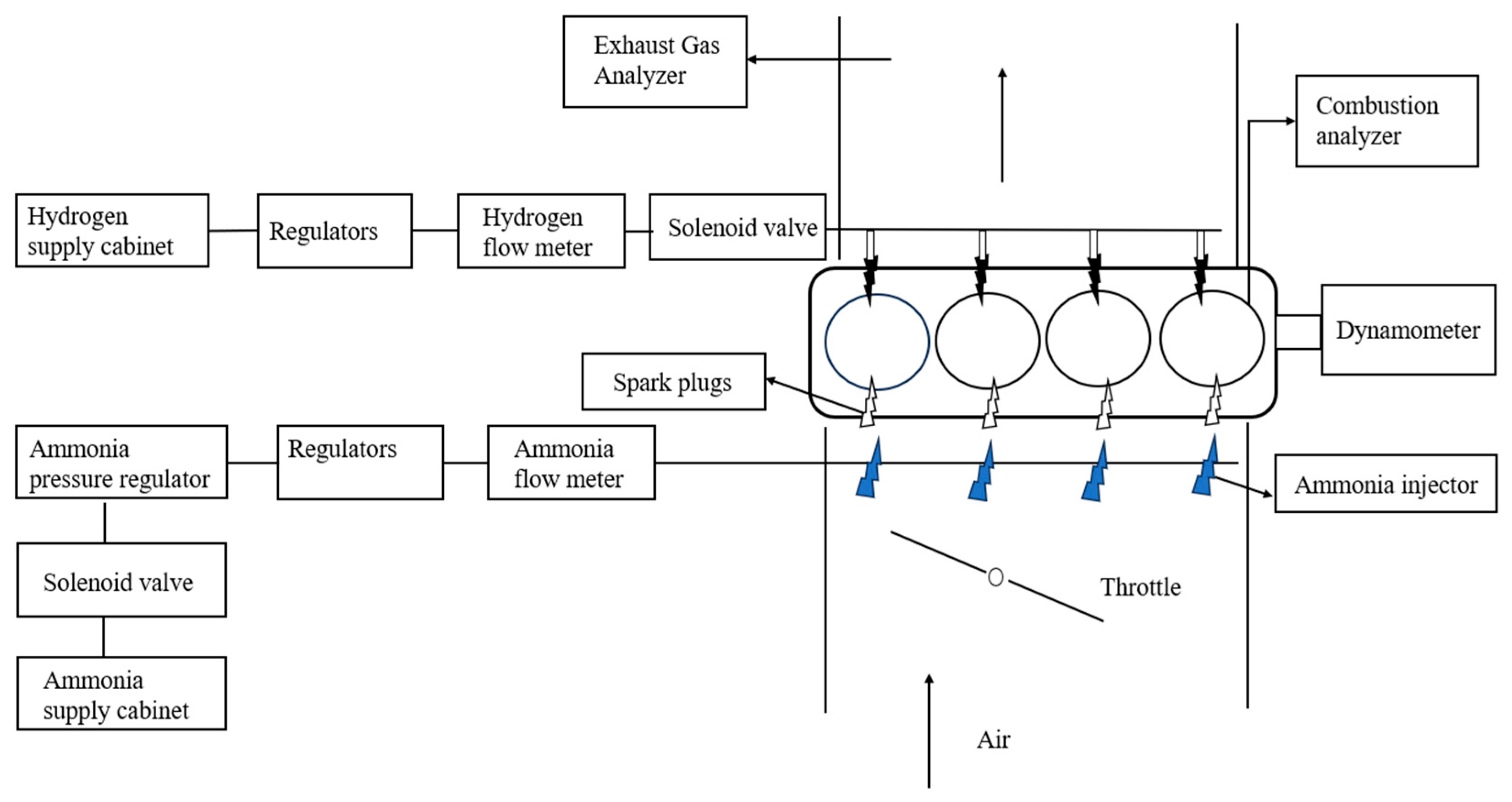- Qi, Y.; Liu, W.; Liu, S.; Wang, W.; Peng, Y.; Wang, Z. A review on ammonia-hydrogen fueled internal combustion engines. eTrans 2023, 18, 100288. [Google Scholar] [CrossRef]