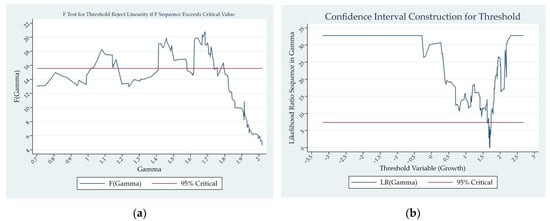 The graph depicts the likelihood ratio function for the level of growth in the nexus between access to clean energy and the renewable energy transition. In (a), the graph shows the F-statistic test for threshold reject linearity if the sequence exceeds the critical value. In (b), the graph shows the meticulous confidence interval construction for the estimated threshold and is presented in Table 4, above.