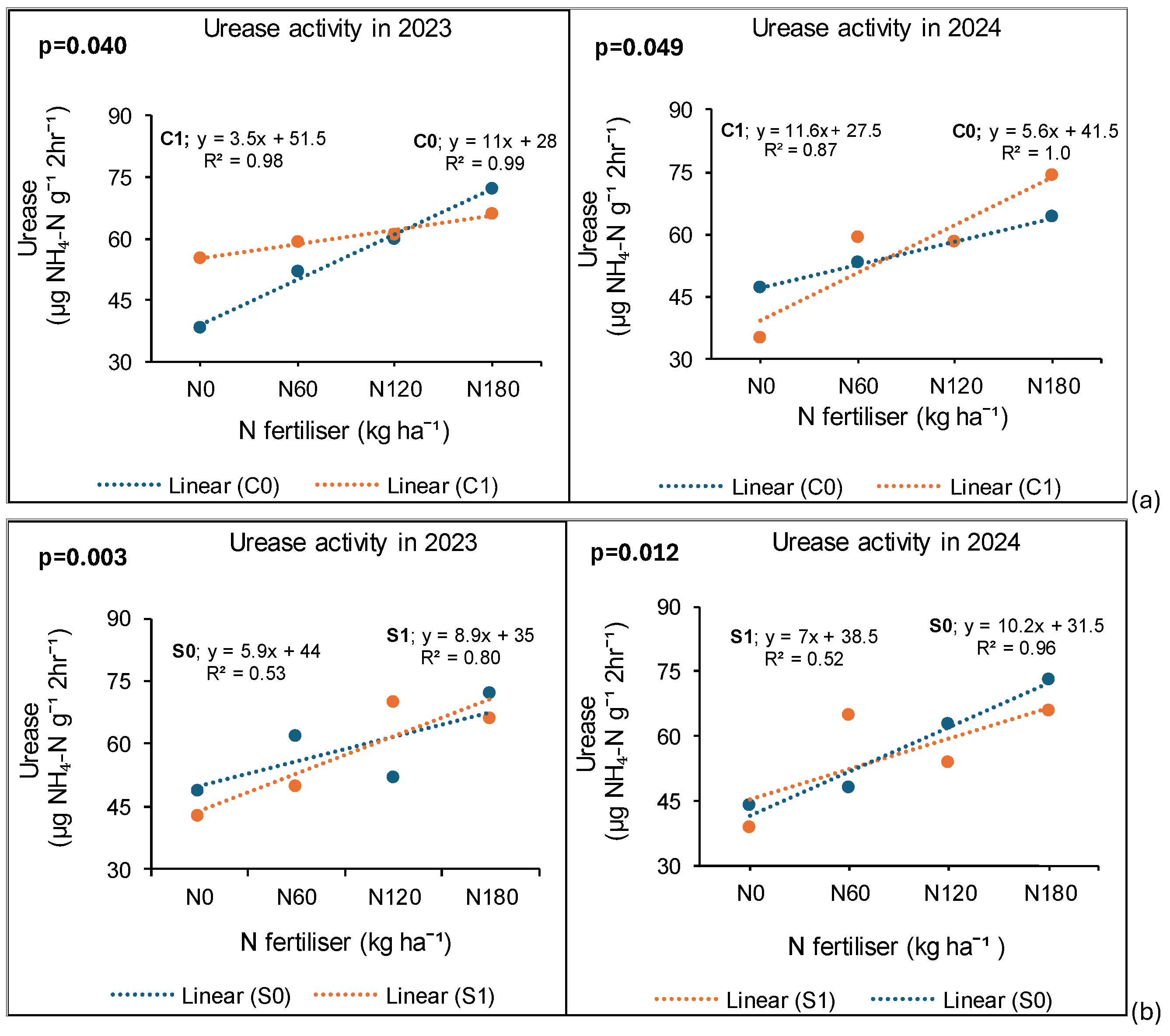 3.7. Treatment Effects on Urease Enzyme Activity