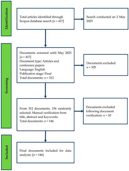 The search was conducted on the Scopus database using a combination of keywords as follows (TITLE-ABS-KEY (“Circular procurement” OR “Sustainable procurement” OR “Circularity” OR “Circular economy”) AND TITLE-ABS-KEY (“Assessment methods” OR “Evaluation techniques” OR “Measurement procedures”)) AND PUBYEAR > 1998 AND PUBYEAR < 2026 AND (LIMIT-TO (DOCTYPE, “ar”) OR LIMIT-TO (DOCTYPE, “cp”)) AND (LIMIT-TO (PUBSTAGE, “final”)) AND (LIMIT-TO (LANGUAGE, “English”)) AND (LIMIT-TO (SRCTYPE, “j”) OR LIMIT-TO (SRCTYPE, “p”)) in the title, abstract or keywords. The Scopus database returned 417 results. The search criteria and exclusion process were as follows: The search was conducted on 2 May 2025. The year was restricted from 1999 to 2025, allowing the inclusion of when formal circular procurement gained traction and the development of the literature in the research domain under review. The search was restricted to the English language and document type (articles and conference papers). A total of 105 documents were excluded. To reduce the subjectivity of manual screening, 50% of the retained publications (312) were selected using a simple random selection method for review [45]. After screening the title and abstract, 10 documents were removed because they did not align with the specific study area or the research theme [46]. The selected articles are those that have a bias towards the built environment. The publishers and journals of 146 documents, with details including keywords, abstracts, authors’ affiliated institutions, and citation counts, were downloaded in CSV for analysis in VOSviewer.