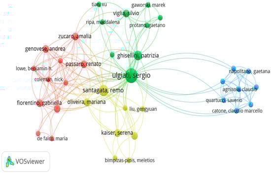 Figure 3 visualises the structure and interconnectedness of the most cited authors’ network. Analysis of the generated VOSviewer visualisation network shows that the cluster with the highest number of authors is red, with eleven authors. This is followed by the green cluster, which contains nine authors. Ulgati, S., Ghisellini, P., and Zucaro, A., all belonging to cluster colour Green, and Santagata, R. [Yellow] are the core of the most cited authors in circular procurement assessment methods. This suggests strong collaboration between authors based on their publications.