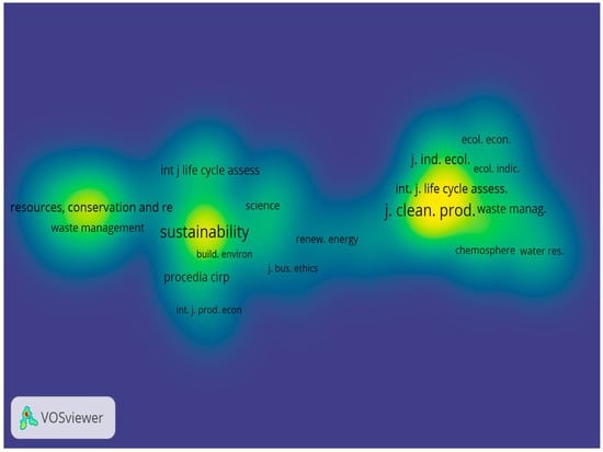 The visualisation density in Figure 5 shows the distribution of the most productive research sources within the network of journal outlets. They can be identified according to clustering together in the three yellow colours. Journals in the same colour cluster signifies that they are frequently co-cited together by other publications. This indicates that they share a common knowledge base and are part of the same scholarly field or sub-discipline. The core areas of the network among the journal outlets are centred around the Journal of Cleaner Production, Sustainability [Switzerland], and Resources, Conservation and Recycling.