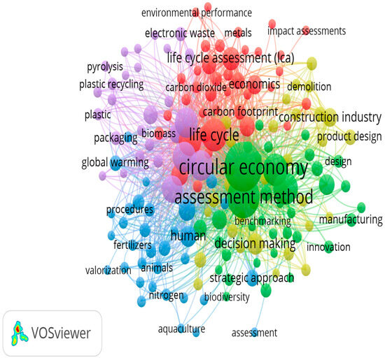 Figure 6 depicts the network of keyword co-occurrence analysis. The keyword network shows a range of areas researched in the domain and how they are connected. The labels and circles represent the items in the network. The large circles within the diagram denote the more frequent occurrences of the keywords [43]. The connections between nodes illustrate the co-occurrence relationship, highlighting how often specific keywords appear together within the literature [68]. The colours of the circles show the clustering results of related topics, and the circles with the same colours belong to the same cluster [43]. As shown in Figure 6, circular economy assessment methods (green) and life cycle assessment (red) were the keywords that were predominantly used from 2009 to 2025 in the circular procurement assessment methods research domain. Other major visualisation keywords include construction industry and decision-making (yellow), environmental performance and impact assessment (red), and global warming (blue).