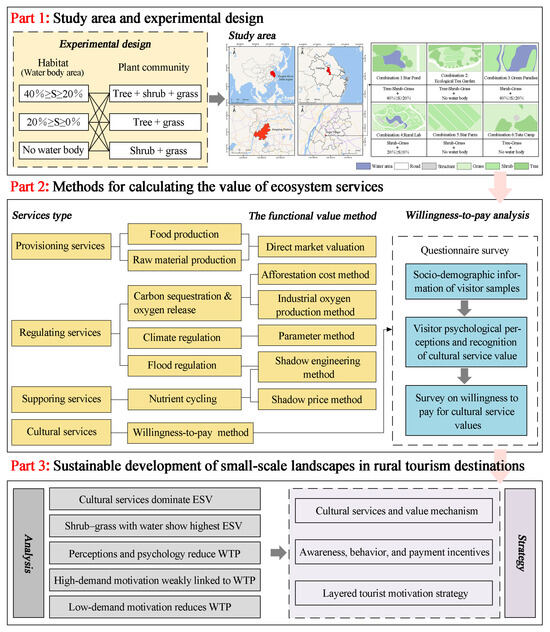 In summary, macro-scale research typically focuses on broad spatial trends and development patterns across extensive areas [34,35], which limits its applicability to specific practical scenarios, particularly in landscape design and management. By contrast, the small-scale approach is considered more operationally feasible and is capable of revealing the response relationships between specific environmental factors and ecosystem services. The employment of quantitative evaluation methods is regarded as providing stronger scientific support for refined landscape planning [36]. In the context of rapid rural tourism development, the complexity of landscape functions has increased, and their services are no longer confined to traditional agricultural production but have expanded to encompass aesthetic, recreational, and educational functions, thereby necessitating more refined identification and optimized allocation. Current research on rural areas remains deficient in systematic investigations of representative scenarios, such as rural tourism sites, and in quantitative analyses of the optimal configuration of landscape pattern elements [16]. This study seeks to identify key influencing factors through an assessment of the Ecosystem Service Value (ESV) of small-scale landscapes in rural tourism destinations within the Yangtze River Delta region, thereby exploring combination types and strategies for enhancing ESV (Figure 1). Based on the aforementioned theoretical framework and the identified research gaps, the following hypotheses are proposed to examine how small-scale landscape features and visitor perceptions influence the ecosystem service value of rural tourism destinations: