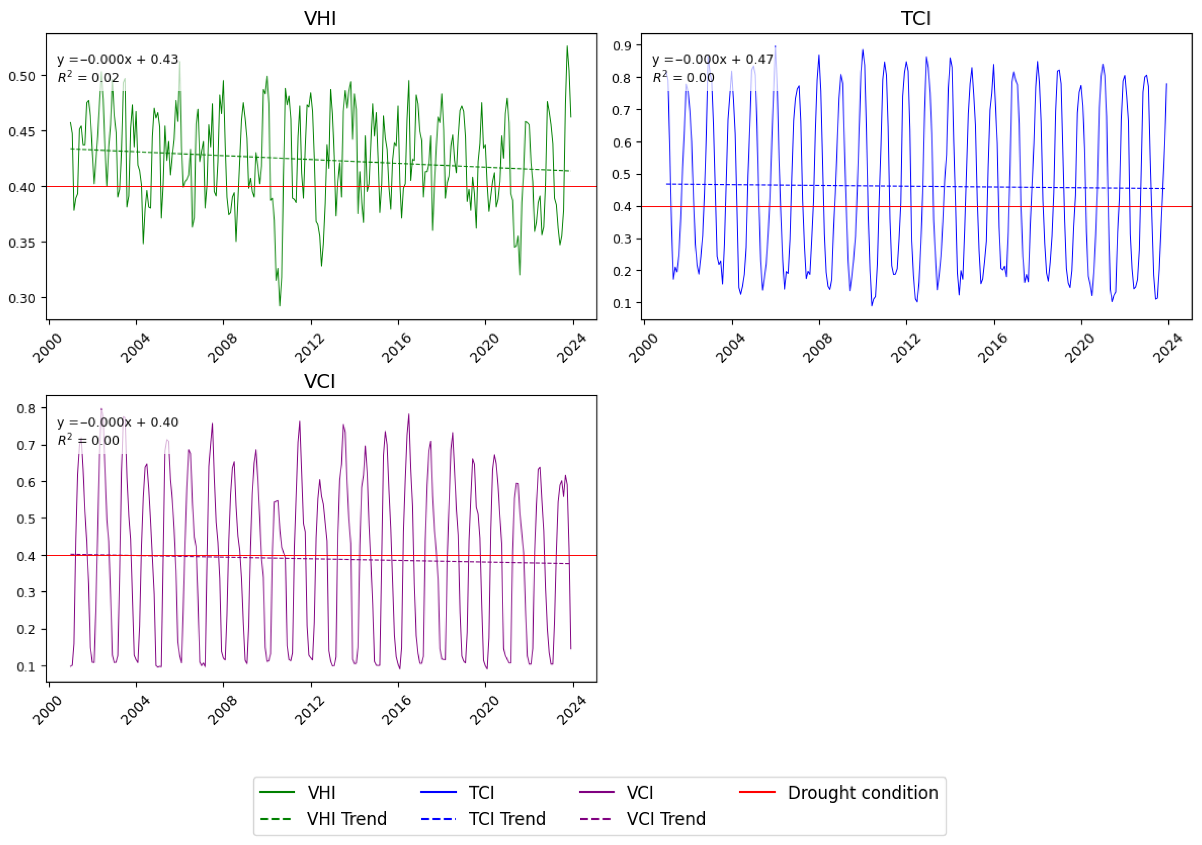| TCI | (3) | Land surface temperature | Assesses thermal stress on vegetation; complements VCI [67]. |