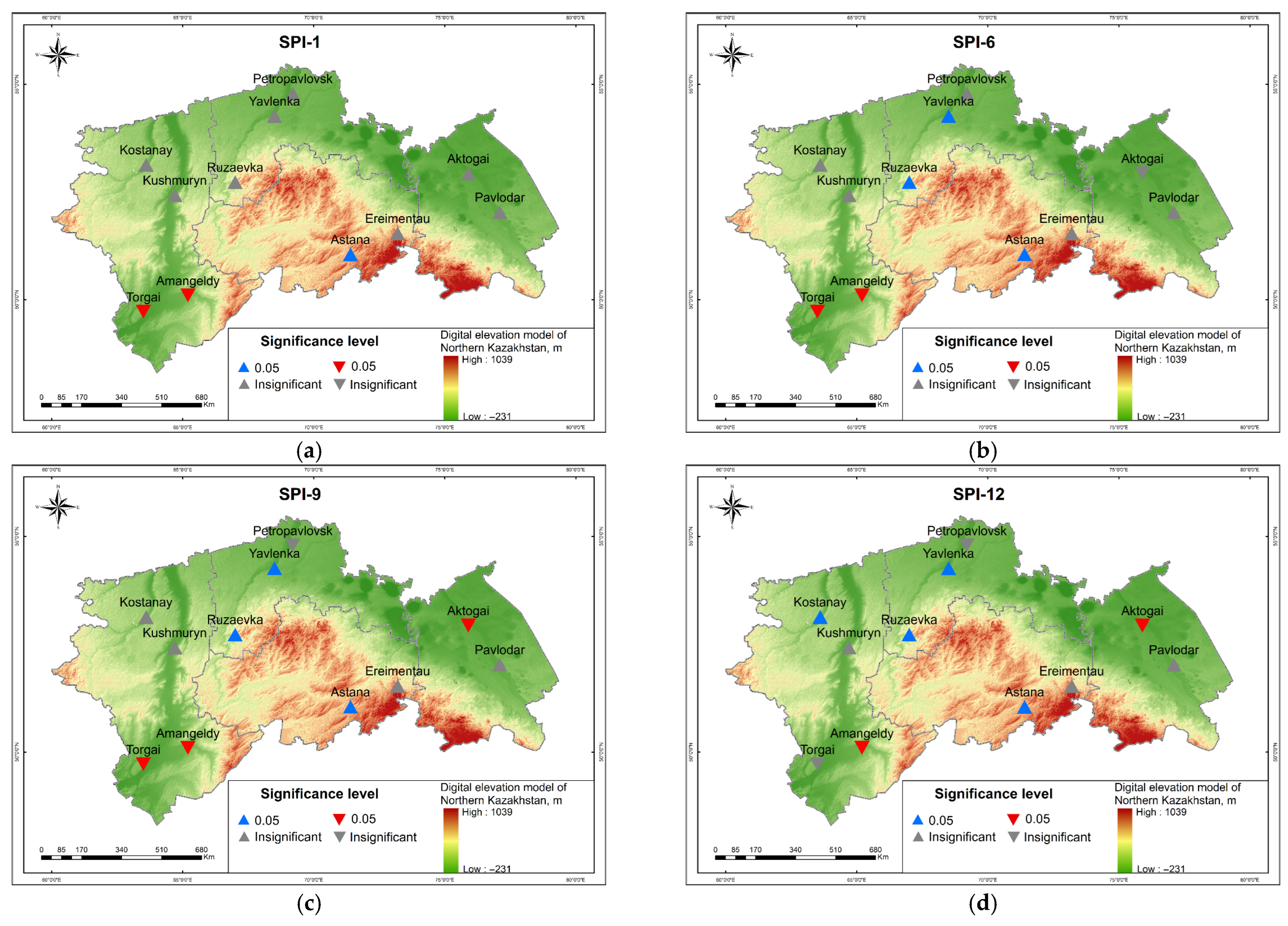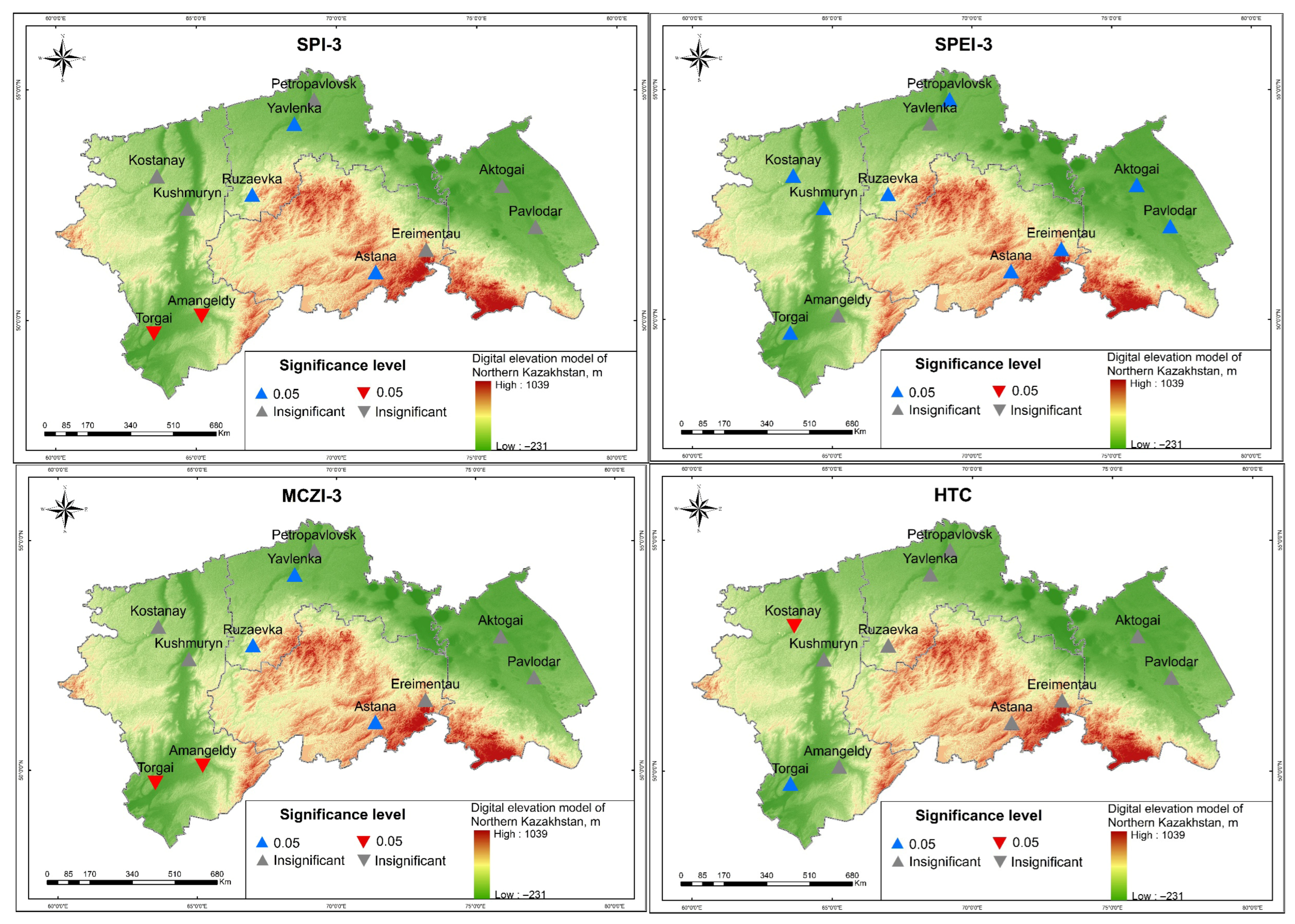 - RSE «Kazhydromet». Issledovaniye i Prognozirovaniye Zasukh v Kazakhstane (Investigation and Forecasting of Droughts in Kazakhstan); RSE «Kazhydromet»: Astana, Kazakhstan, 2010. [Google Scholar]