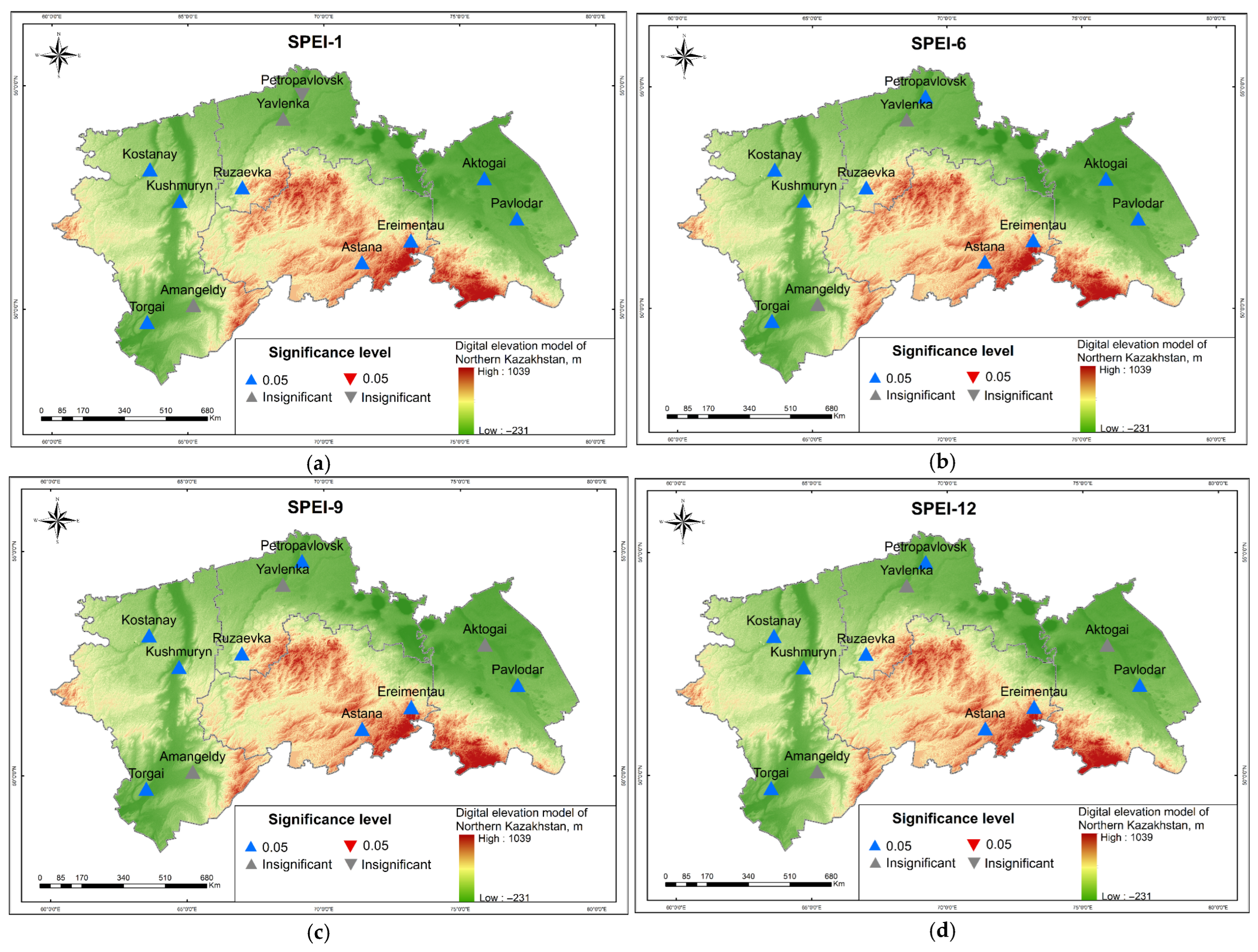- Farooq, I.; Shah, A.R.; Sahana, M.; Ehsan, M.A. Assessment of Drought Conditions Over Different Climate Zones of Kazakhstan Using Standardised Precipitation Evapotranspiration Index. Earth Syst. Environ. 2023, 7, 283–296. [Google Scholar] [CrossRef]