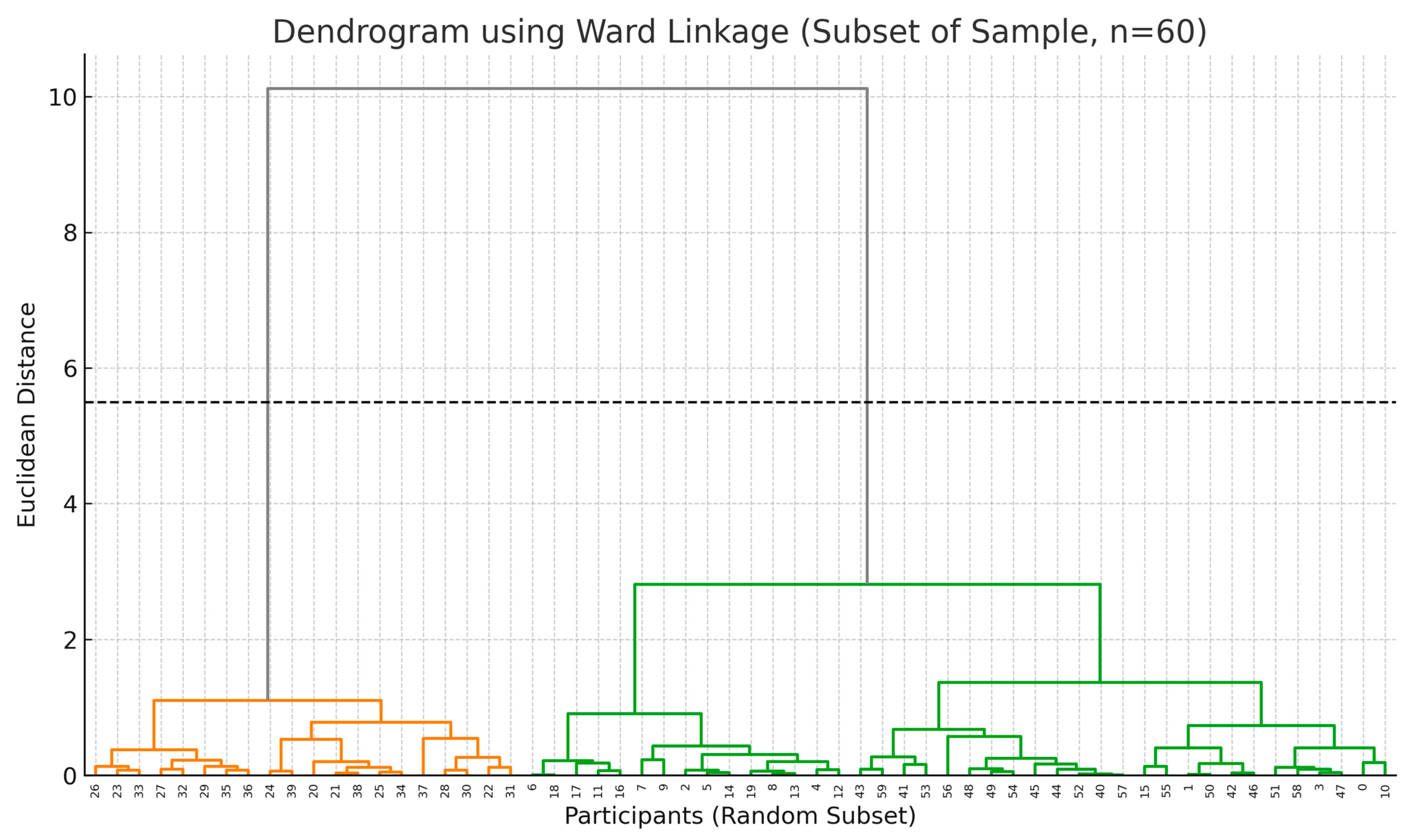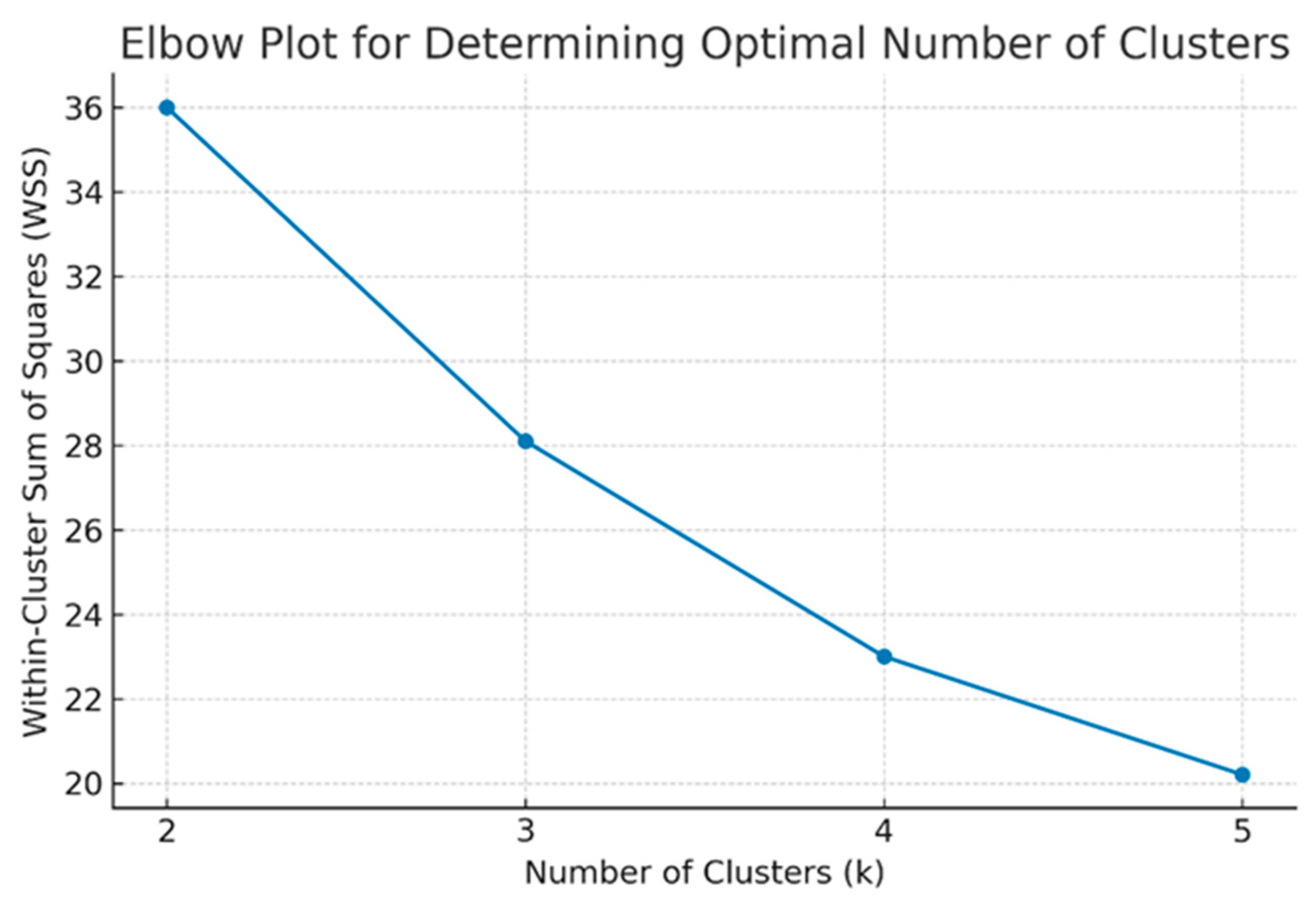 To ascertain the optimal number of clusters in the present K-means clustering analysis, we evaluated instances of k = 2, k = 3, and k = 4 using a combination of statistical diagnostics and theoretical interpretability. The within-cluster sum of squares (WSS) is reported for each solution. The most notable decline in the WSS occurred between k = 2 (WSS = 280.54) and k = 3 (WSS = 242.42); the decline from k = 3 to k = 4 (WSS = 226.01) was minor. Both our study’s findings and the WSS results suggest an evident “elbow” at k = 3, which aligns with the elbow method [