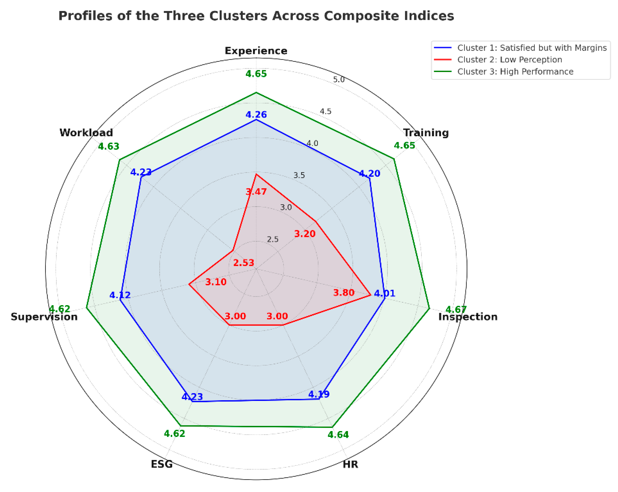 The analysis indicates that the groups identified by K-Means were both very different and statistically significantly different on all of the key indicators except for the difference between Cluster 1 and Cluster 2 when examining Inspection, which was not significant. However, Cluster 3 had a very positive perception about all areas (training, supervision, experience, workload, ESG, etc.). Cluster 1 has an overall satisfactory image but had slightly lower averages than Cluster 3. Cluster 2 showed much lower perception overall, revealing a possibly low perception and difficulty, which can lead to improvements in the organization; However, it only holds a small part of the data itself (n = 5), it still should be considered important.