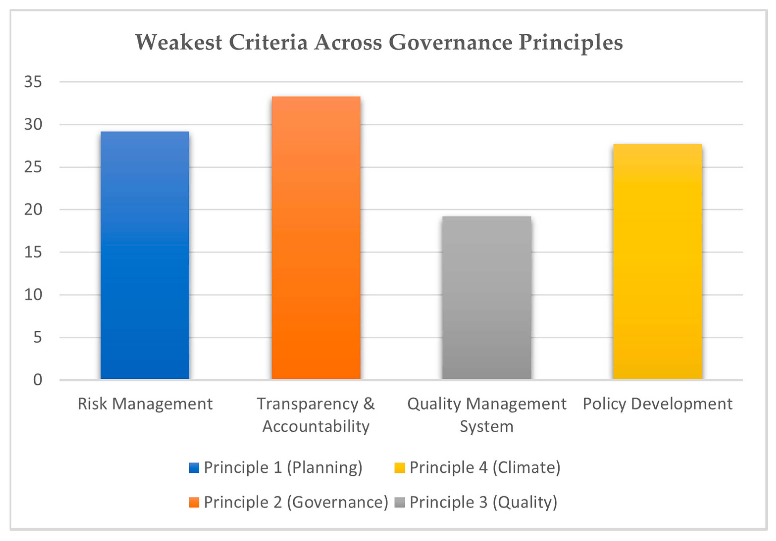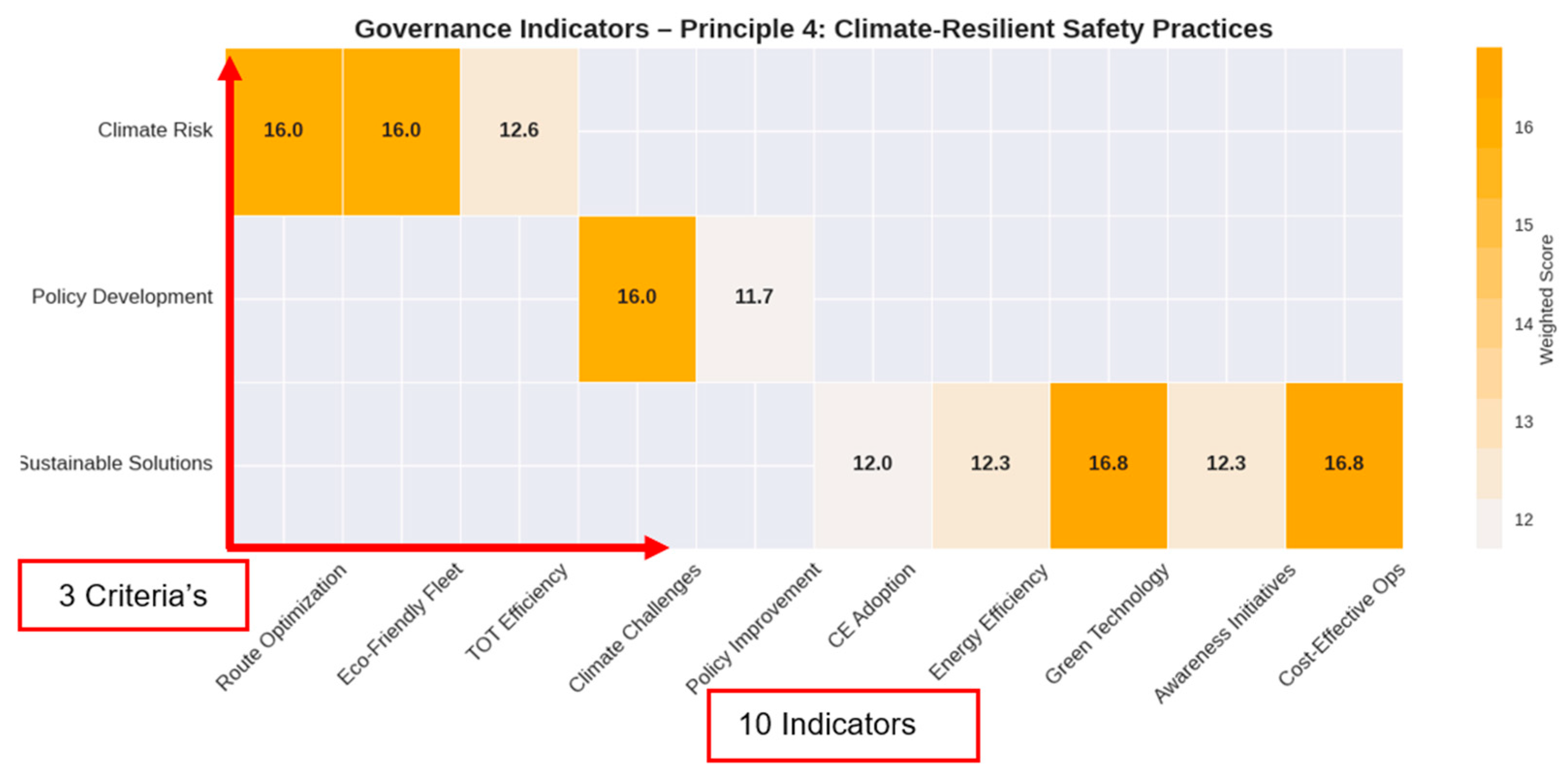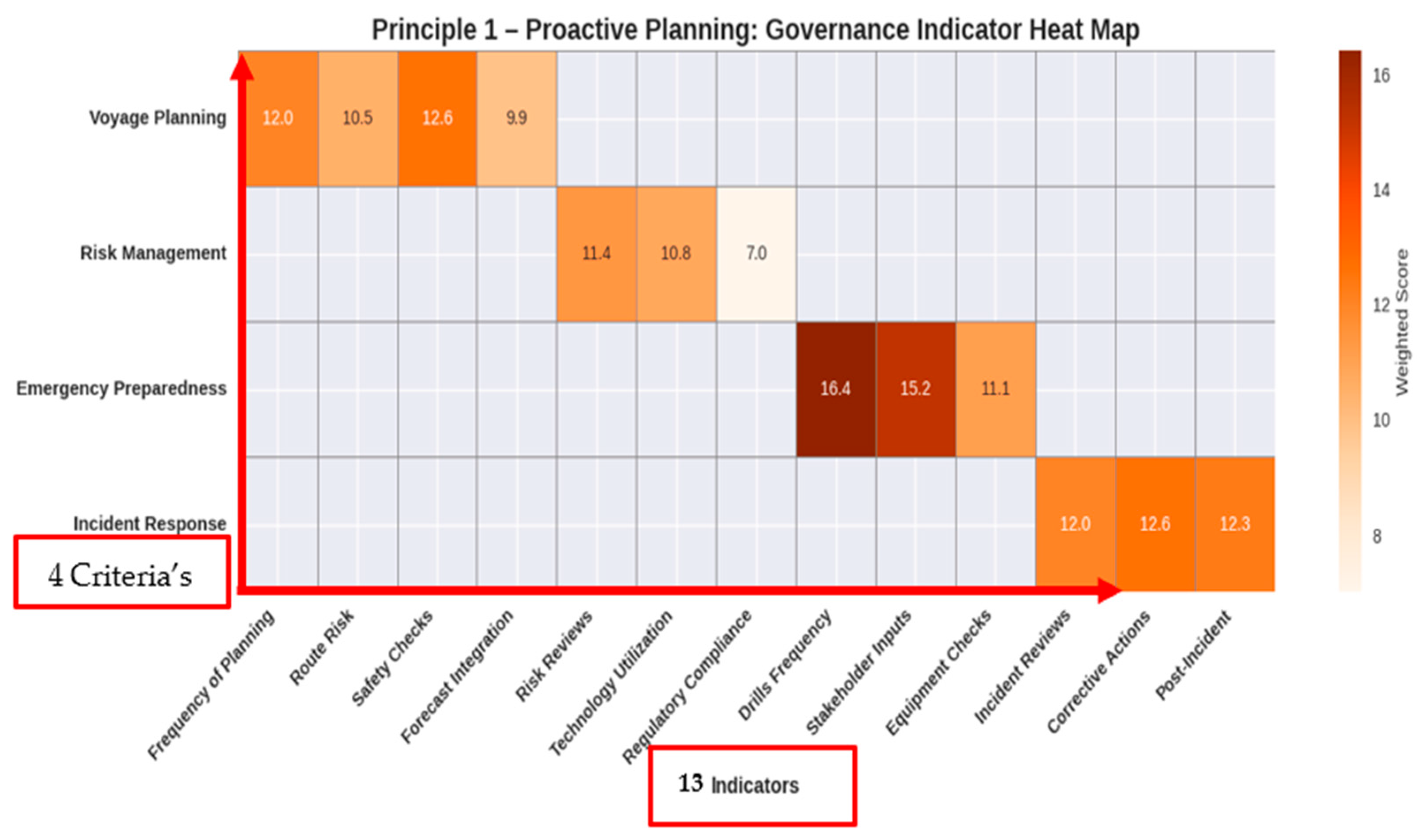 Figure 4 highlights the weakest-performing criteria across the four governance principles. Risk management under Principle 1 recorded the lowest weighted score among proactive planning measures, indicating insufficient consistency in applying systematic reviews and advanced technologies. Under Principle 2, transparency and accountability lagged, reflecting weak institutionalization of reporting and public disclosure. Principle 3 revealed critical gaps in quality management systems, particularly in embedding rights-based standards and sustainable practices. Finally, under Principle 4, policy development scored lowest, emphasizing the need for continuous updates and climate-specific frameworks. These results feature that strengthening these weak criteria is pivotal for improving overall governance maturity in the domestic ferry sector.