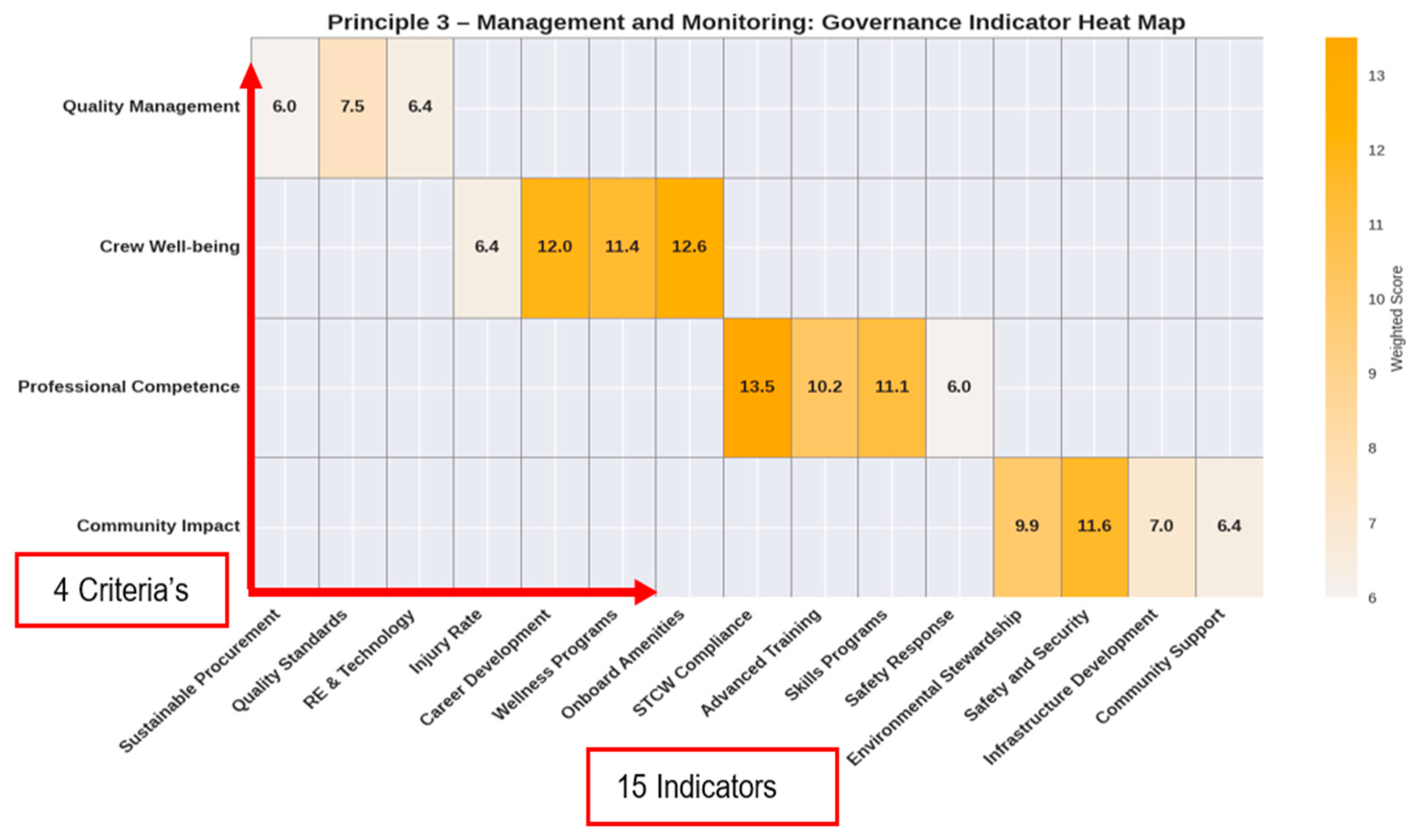 • Principle 3 spans quality management, crew welfare, and training, aligned with STCW standards, with 15 indicators.