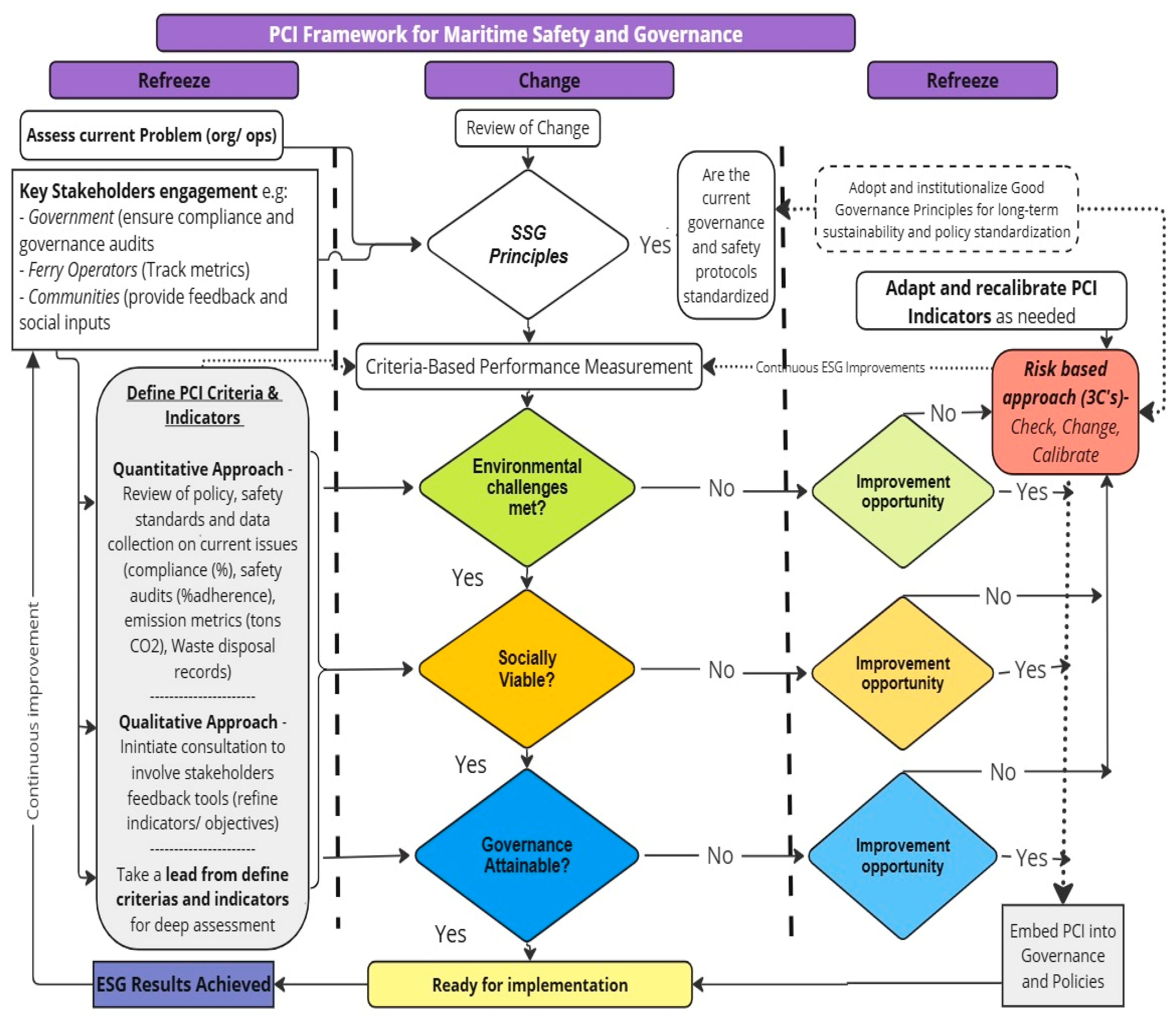 The present study recommends a governance model stressing accountability, transparency, and continuous improvement by identifying key issues. This model intends to effectively mitigate challenges by aligning national policies with international best practices and strengthening a safety-oriented culture. Although IMO identifies the significance of addressing human factors and organizational for transformative change, yet this needs a re-evaluation of existing regulations [12]. A novel PCI (Principles, Criteria, and Indicators) framework is developed to systematically assess safety, governance, and sustainability within domestic ferry operations. While integrating emerging ESG standards to ensure a structured approach to maritime safety, the framework assesses governance adequacy and policy effectiveness at national and international levels.