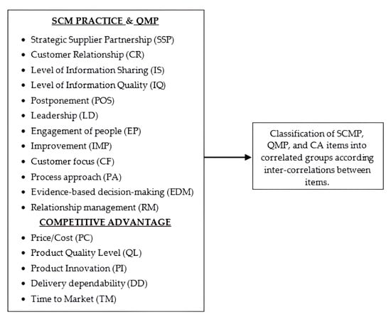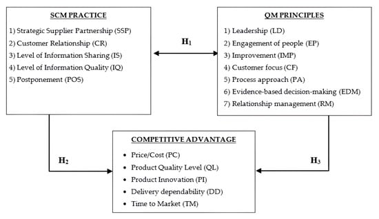 Likewise, firms that effectively implement SCMP can optimize resource utilization, improve coordination with partners, and enhance responsiveness to market demands, all of which contribute to a stronger competitive position []. Similarly, the adoption of robust QMP enables companies to deliver superior products and services, increase customer satisfaction, and differentiate themselves from competitors, thereby strengthening their CA [].