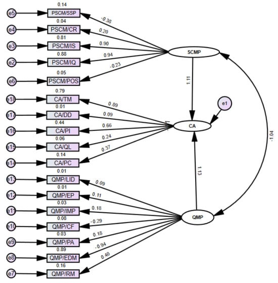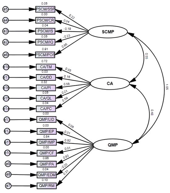 As shown in Table 8, four analytical models are applied to validate the relationships between SCMP, QMP and CA, sharing a common focus on latent constructs while differing in methodology, model type, measurement level, and treatment of endogenous variables. Model 1 employs a BBMA using a CFA framework with correlated constructs, focusing solely on first-order latent variables without endogenous variables. Model 2 also uses an BBMA within a SEM framework, incorporating direct effects on CA treated as a single construct and combining first-order latent variables with structural paths.