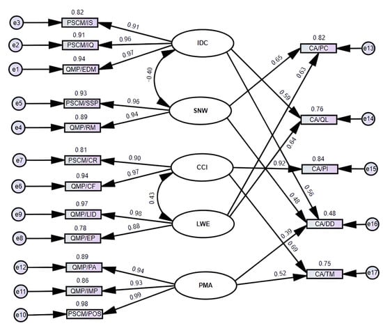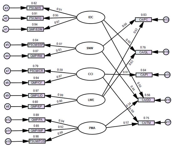 The reliabilities of SCMP, QMP and CA were assessed with Cronbach’s Alpha. Table 4 report means, standard deviations and reliability values for each of the constructs. Reliability values for all constructs are greater than 0.70, which are considered acceptable [].