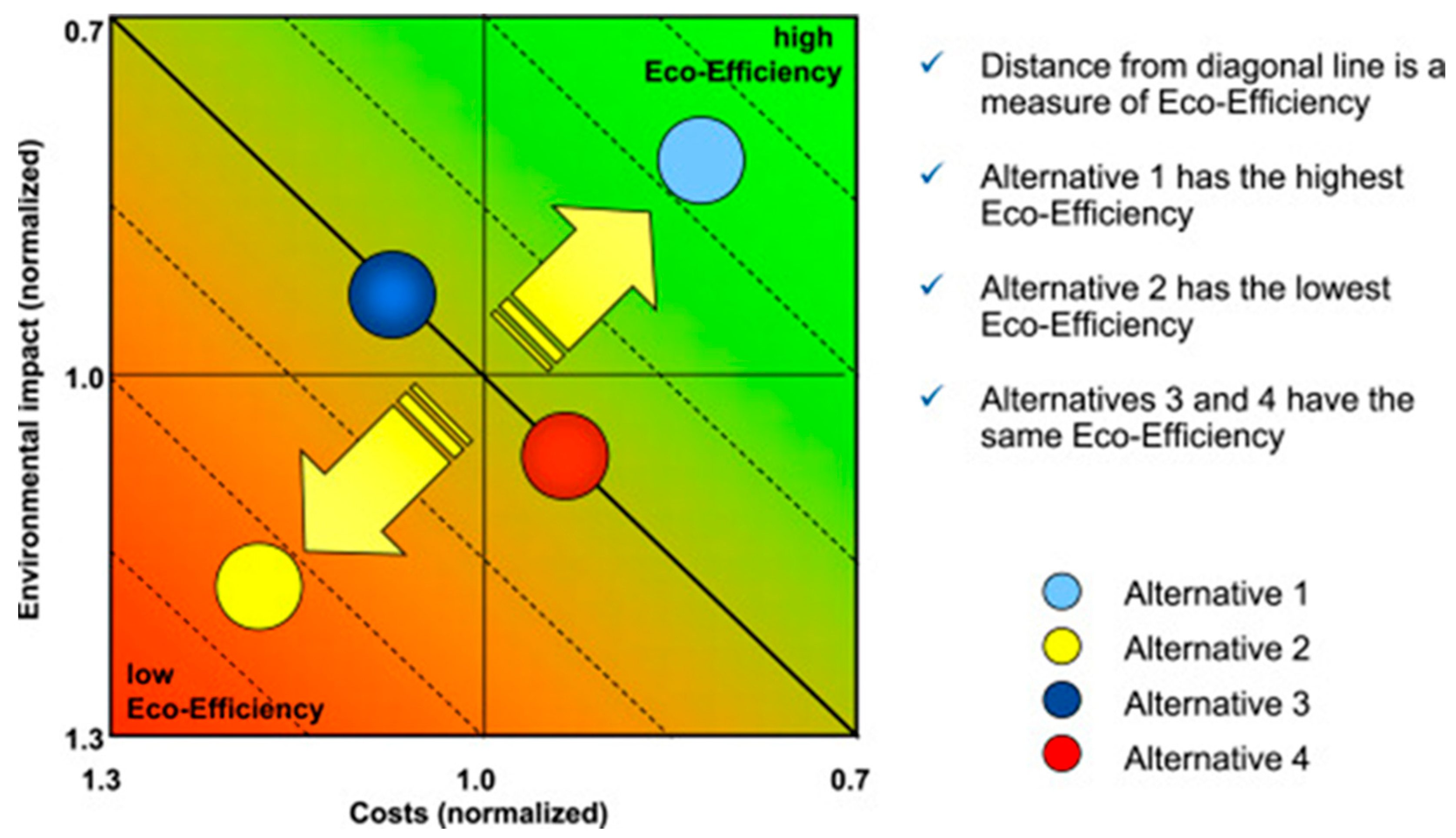 23]. Eco-efficiency is conceived as an indicator expressing the ratio between a product’s added value and its environmental impacts. According to ISO 14045 [