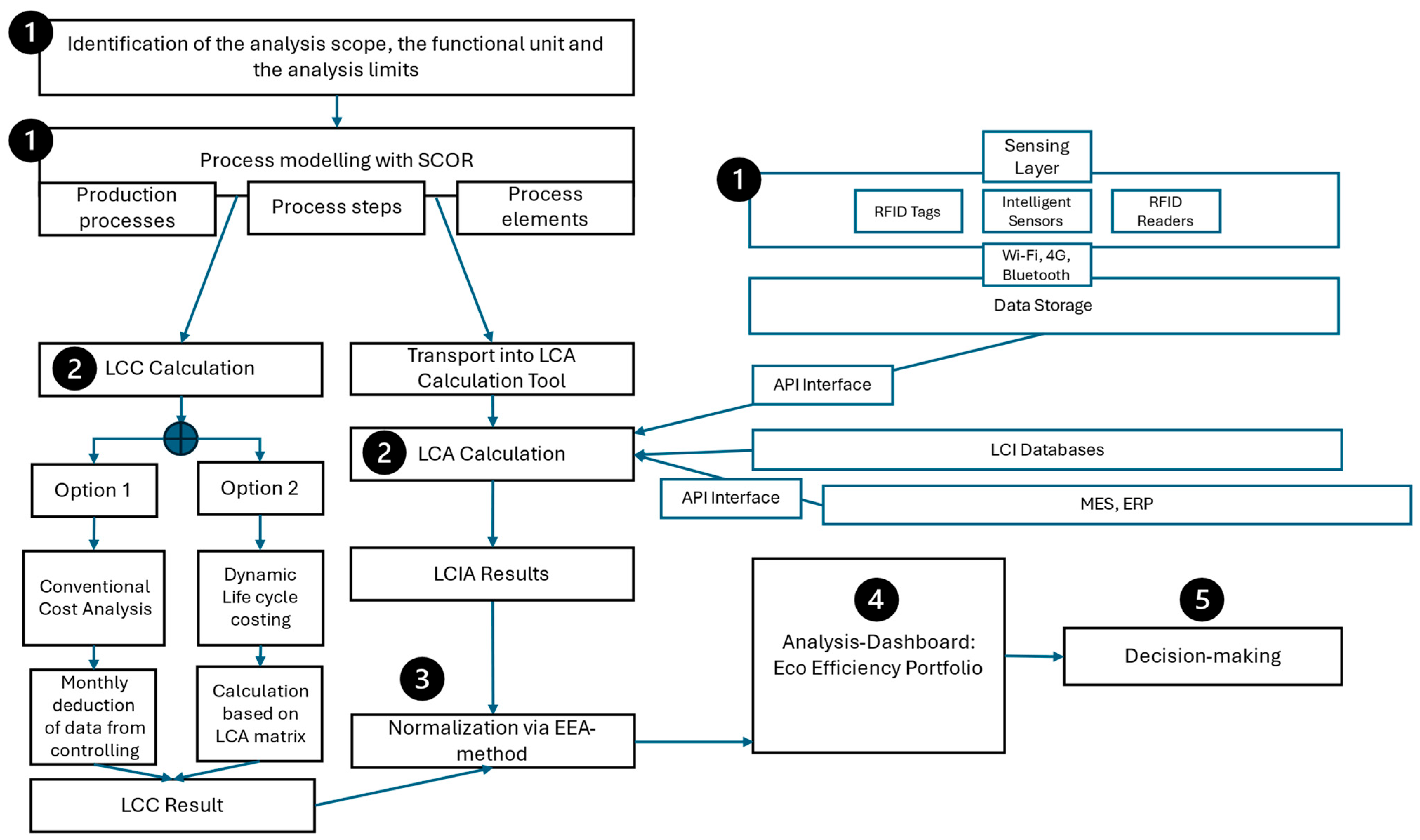 11]. This raises a series of questions: How, precisely, should data for LCA and cost calculations be gathered? Through which processes can such data be reliably processed? How can real-time analysis be structured to effectively integrate dynamic market and technological changes? Finally, how can results be visualized and communicated to become a robust decision-making tool?