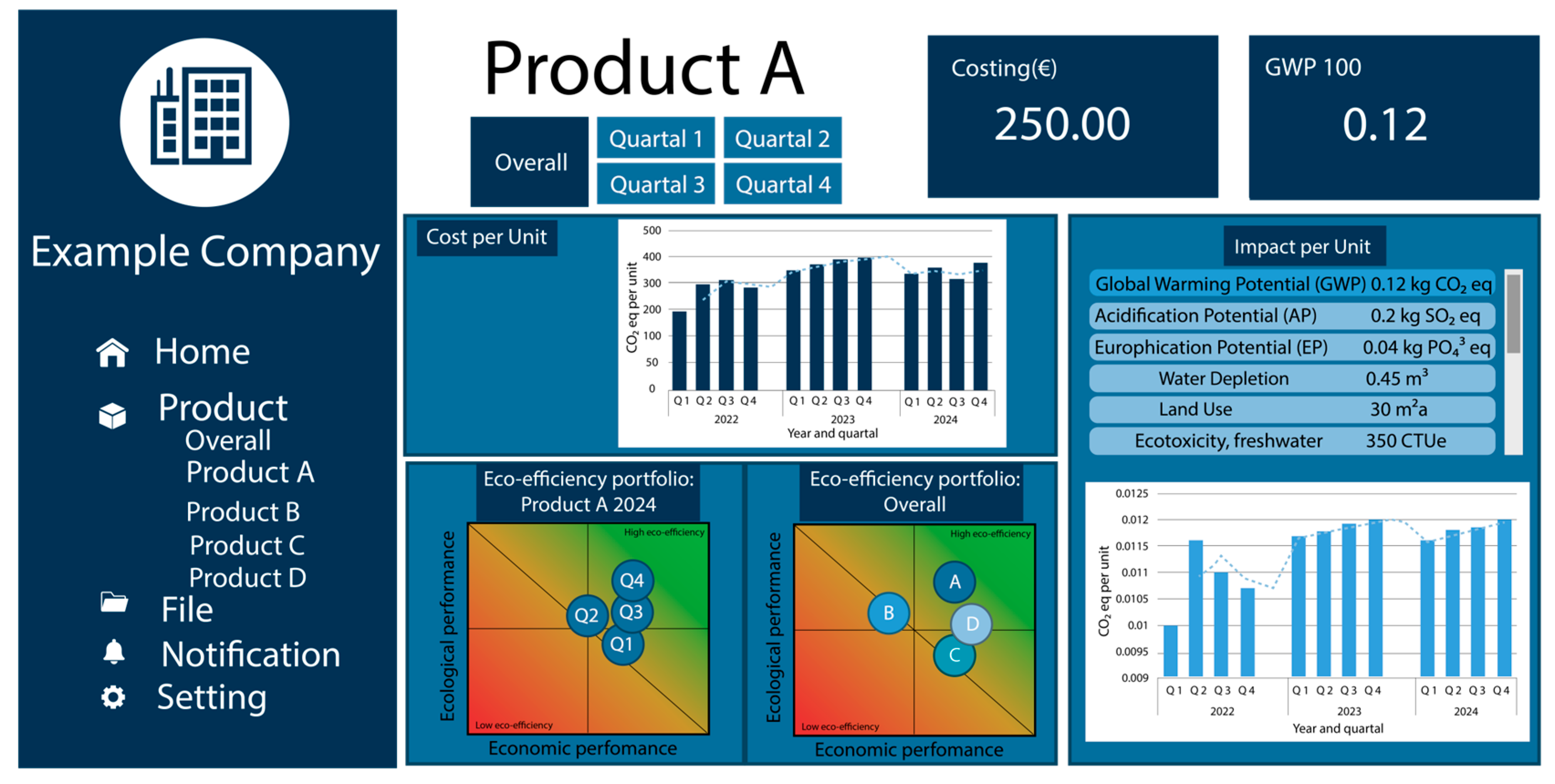 Historical values of the eco-efficiency portfolios of different products are observed to track changes, assess the degree of influence of previous decisions, and evaluate the resulting development or decline in the performance of individual products within the portfolio. In logistics, the dashboard can be filtered by route, vehicle type, and delivery pattern. It shows 7- and 30-day rolling eco-efficiency for long-distance and last-mile operations, highlights problem areas such as low load factors or urban congestion and allows testing of “what-if” scenarios for re-routing or load consolidation.