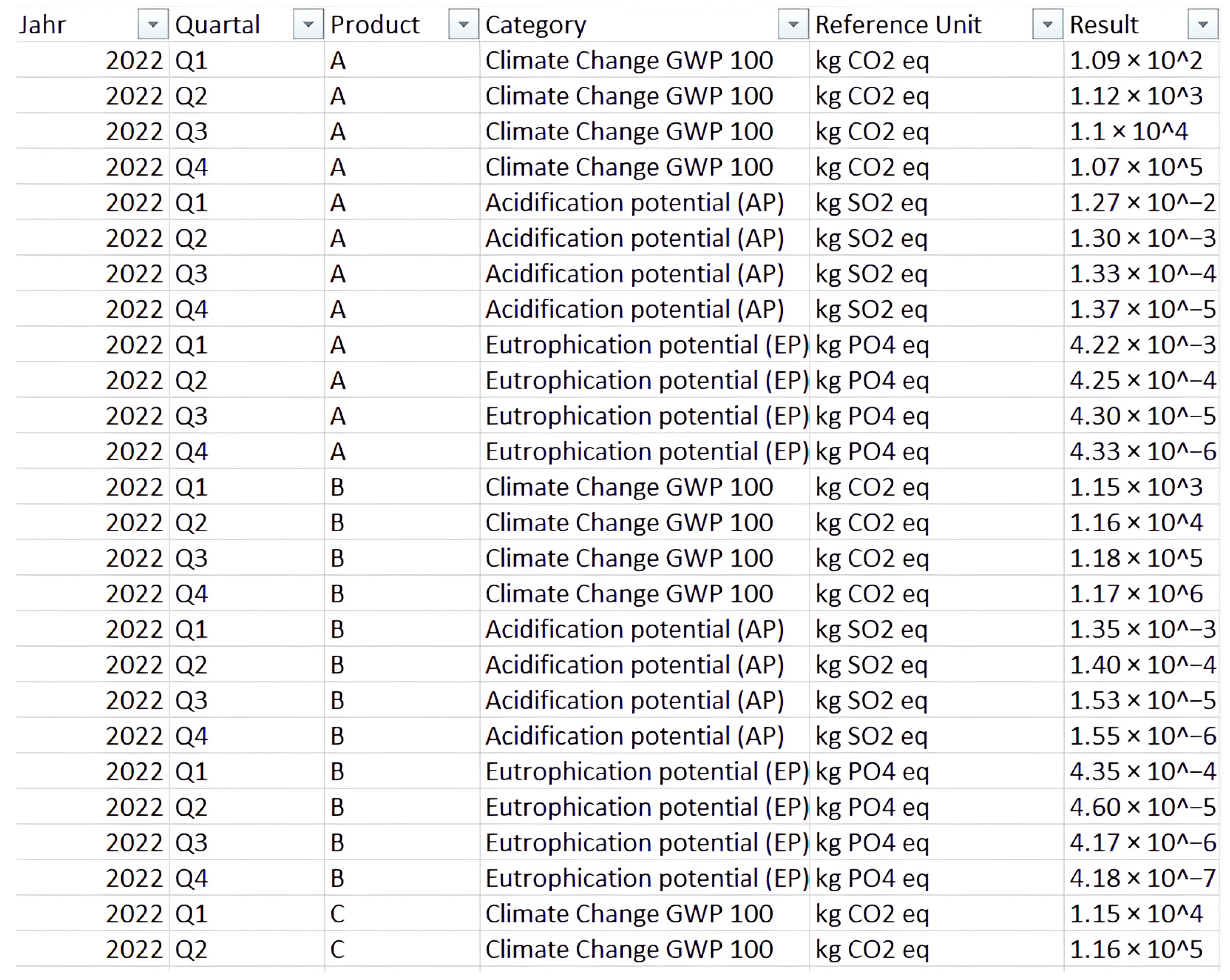 Similar markers for individual LCIA categories. Total value, as well as separate graphs for each product, for each time period, and for each of the available impact categories. As an example, shown in