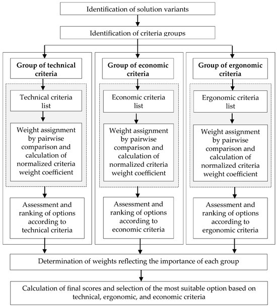 - Partial scores for each variant with respect to each criterion are calculated as the product of the point score and the weight according to the formula . The total score for each variant was computed separately for the three groups of criteria, which allowed obtaining independent partial evaluations. This can be expressed as: Normalization of the scores was performed independently for each group of criteria, according to the relation: .