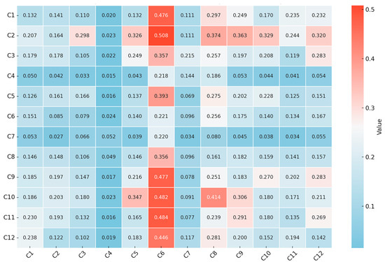 Figure 4 shows the heatmap of the total influence matrix between criteria derived from the DEMATEL method, where each cell value represents the impact of one criterion on another. Red shades indicate stronger positive impacts, while blue shades represent weaker impacts. The figure reveals strong positive causal relationships between certain criteria, especially the impact of C2, C10, and C11 on C6, which are predominantly shown in red (with values of 0.508, 0.482 and 0.484, respectively, among the highest in the matrix). Some criteria have weaker influences on others, such as C5, C9, and C11 on C4, represented by blue regions in the heatmap (all with influence values below 0.02). This implies that C6 is a core outcome factor highly driven by C1, C2, and C9, while C4 remains relatively independent of changes in other criteria.