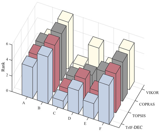 The comparison with existing MCDM methods demonstrates a significant degree of consistency in the evaluation results. This experiment compared TrIF-DEC with three mainstream MCDM methods, including TOPSIS, VIKOR, and COPRAS. All methods used the same comprehensive weights and scoring data to ensure consistency and fairness in evaluation conditions. The experimental results show that scheme C consistently ranks first across all methods, while Designs F and B remain in the fifth and sixth positions, respectively. This outcome not only confirms the scientific validity of the TrIF-DEC evaluation but also validates its compatibility with mainstream methods.