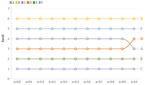 To examine the impact of weight preference factor α on the final ranking of design schemes, this study conducted a sensitivity analysis by adjusting α within the range of 0 to 1, with a step size of 0.1, to observe changes in the allocation of subjective and objective weights. This factor reflects the trade-off between the subjective preferences of relevant stakeholders and objective conditions in the decision-making process.