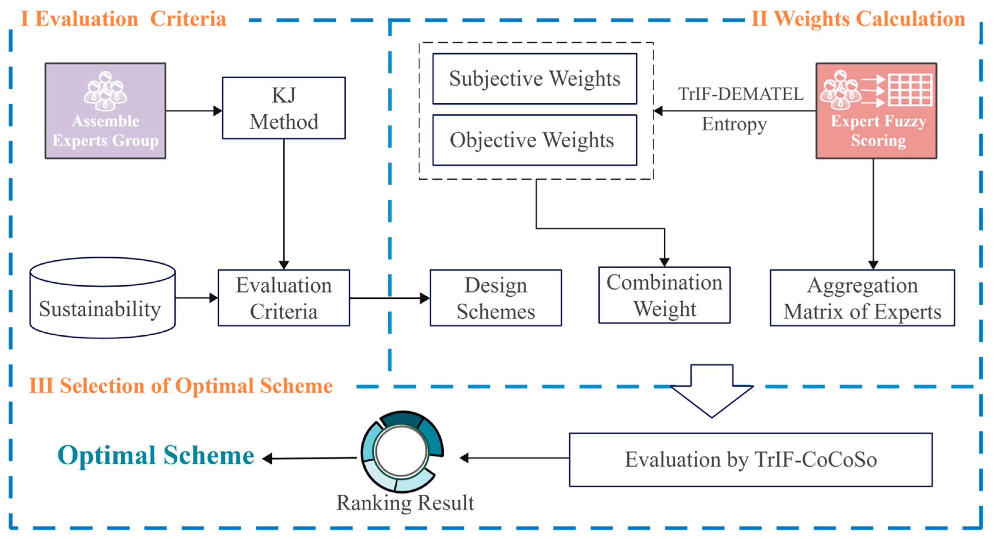 To address these challenges, this paper proposes an evaluation framework based on Trapezoidal Intuitionistic Fuzzy (TrIF), named TrIF-DEC, which integrates Decision-Making Trial and Evaluation Laboratory (DEMATEL), Entropy, and Combined Compromise Solution (CoCoSo). Specifically, the framework begins by using the KJ method (named after its creator, Jiro Kawakita) to systematically gather expert opinions and construct a sustainability criteria system across four dimensions: social, economic, technological, and environmental. TrIF are then introduced to more precisely capture the fuzziness and hesitation in linguistic evaluations, offering a high-fidelity modeling approach for expert judgments. Next, DEMATEL is used to reveal the causal relationships between criteria and generate subjective weights, while the Entropy method calculates the objective weights based on quantitative data. The results are then combined to form a comprehensive weight that integrates both subjective and objective factors. Finally, the CoCoSo is used to integrate multi-perspective evaluation strategies for scheme ranking, enhancing the robustness and resilience of the ranking results. Through the structural integration of multiple methods and innovative modeling of evaluation uncertainties, this framework provides full-process support for design decision-making. To clearly present the methodological choices made in this study,