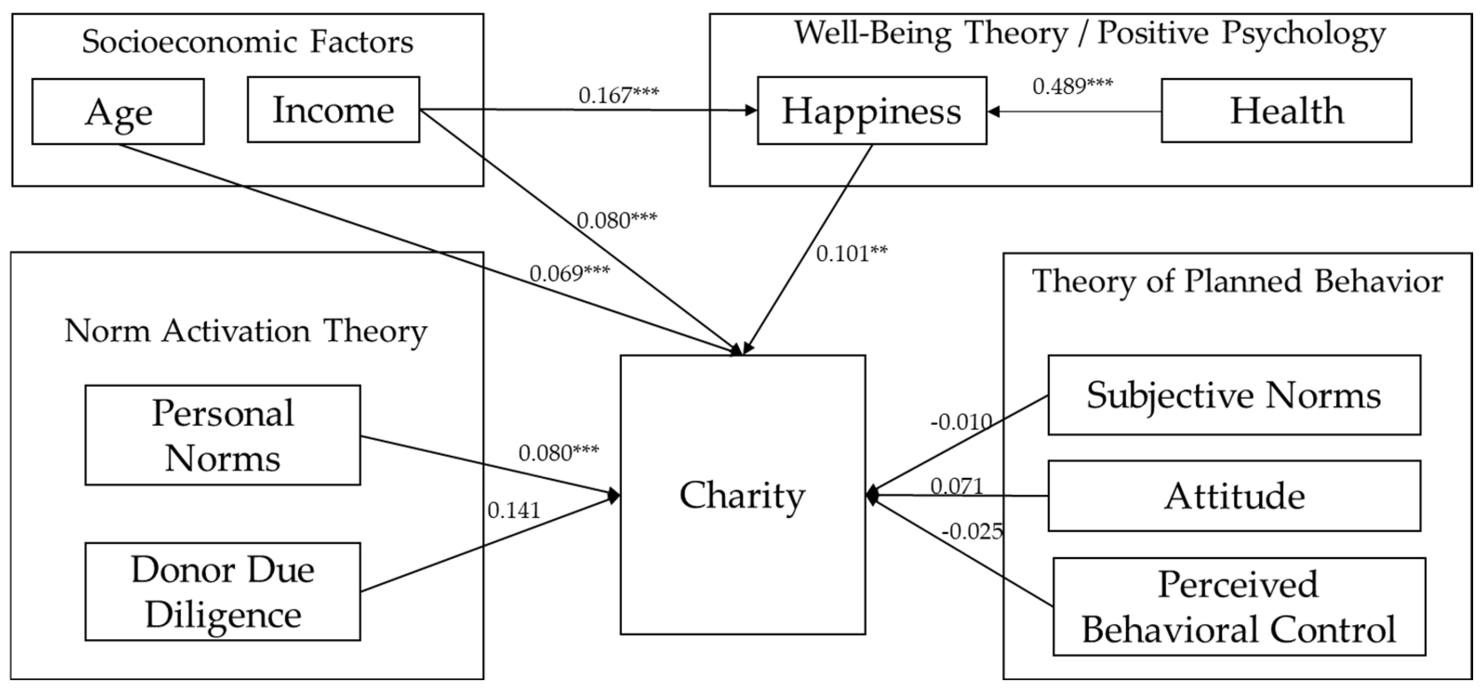 - Van der Linden, S. Charitable intent: A moral or social construct? A revised theory of planned behavior model. Curr. Psychol. 2011, 30, 355–374. [Google Scholar] [CrossRef]