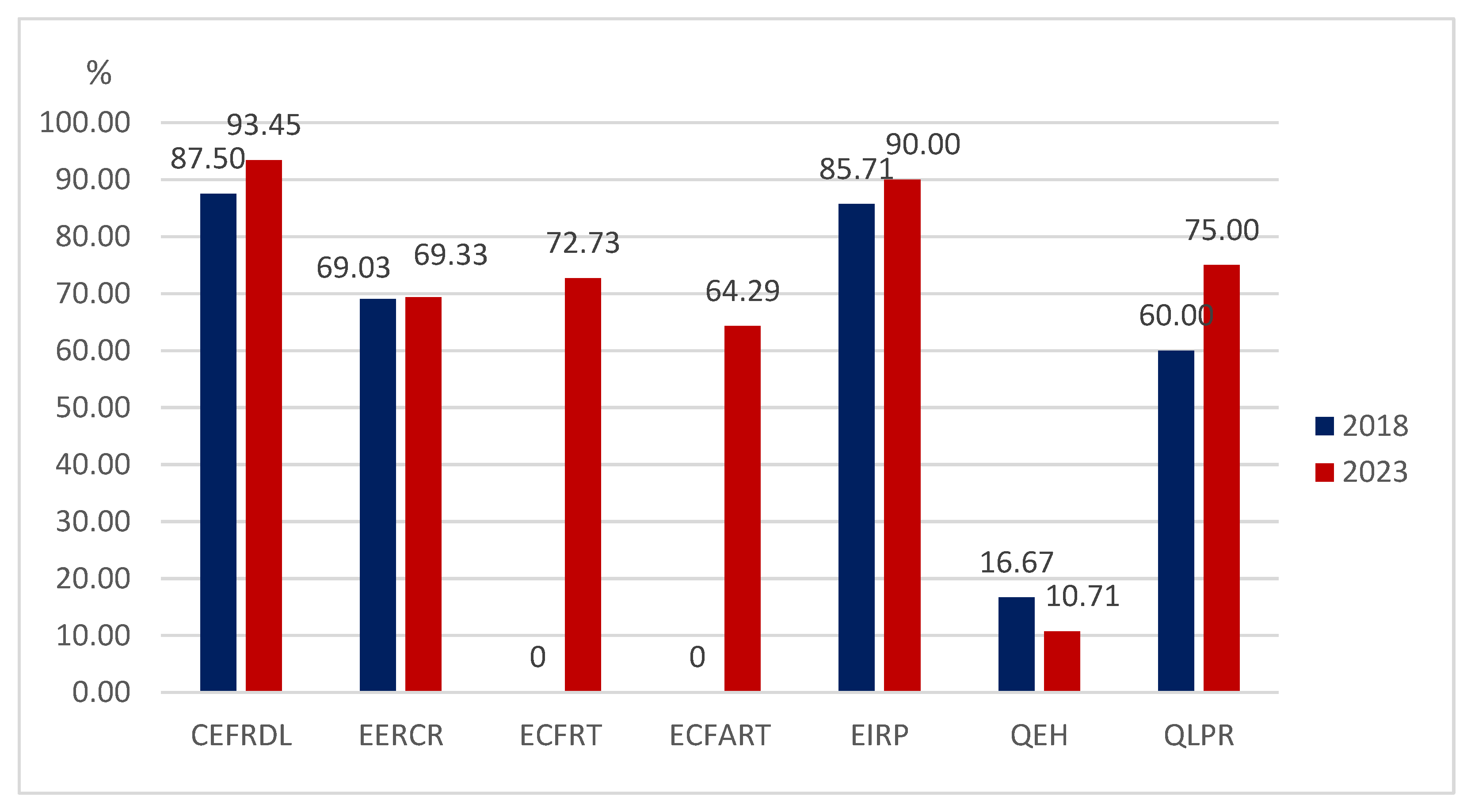 | Indicators | Equation | Calculation 2018 (%) | Calculation 2023 (%) |