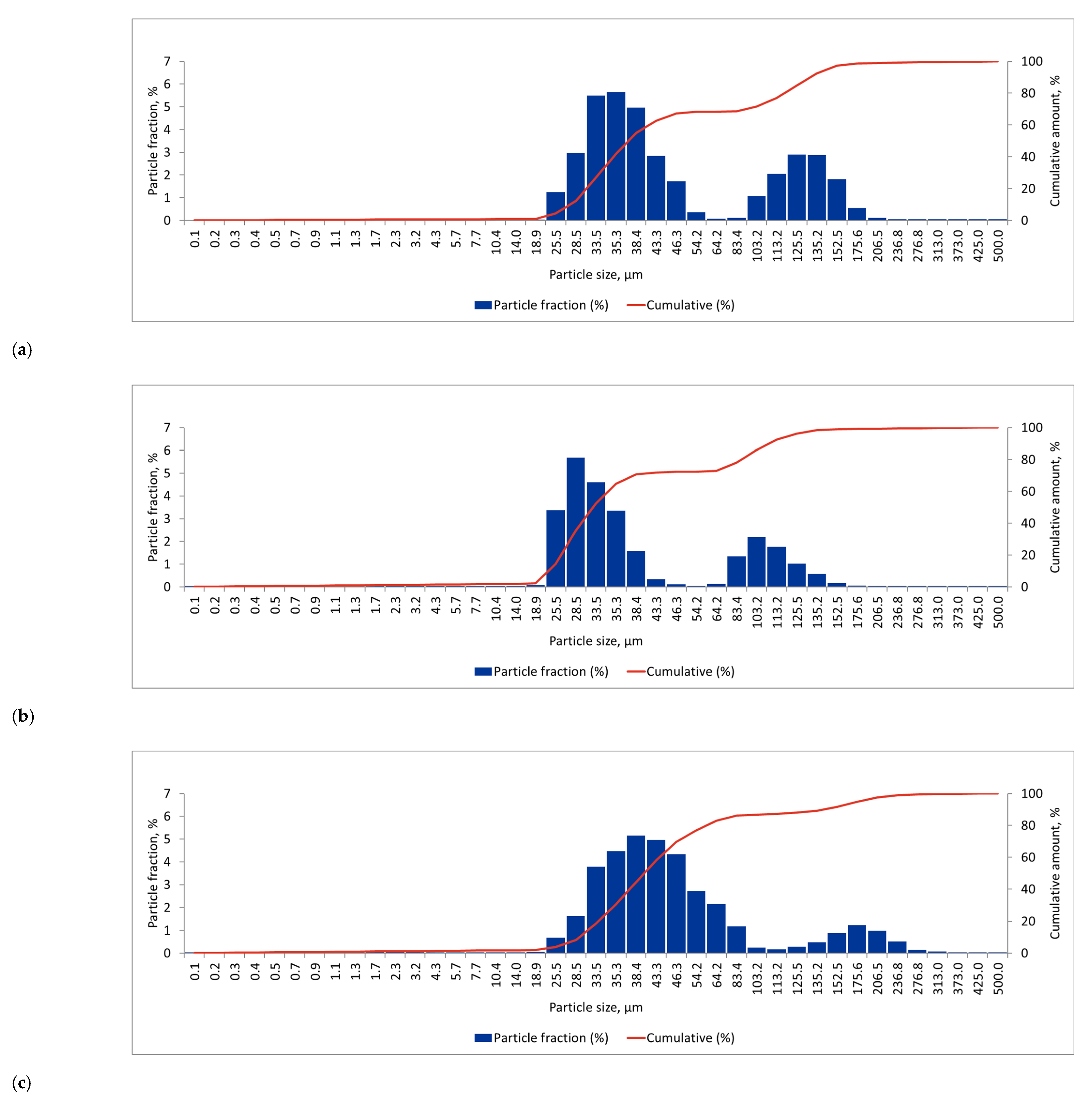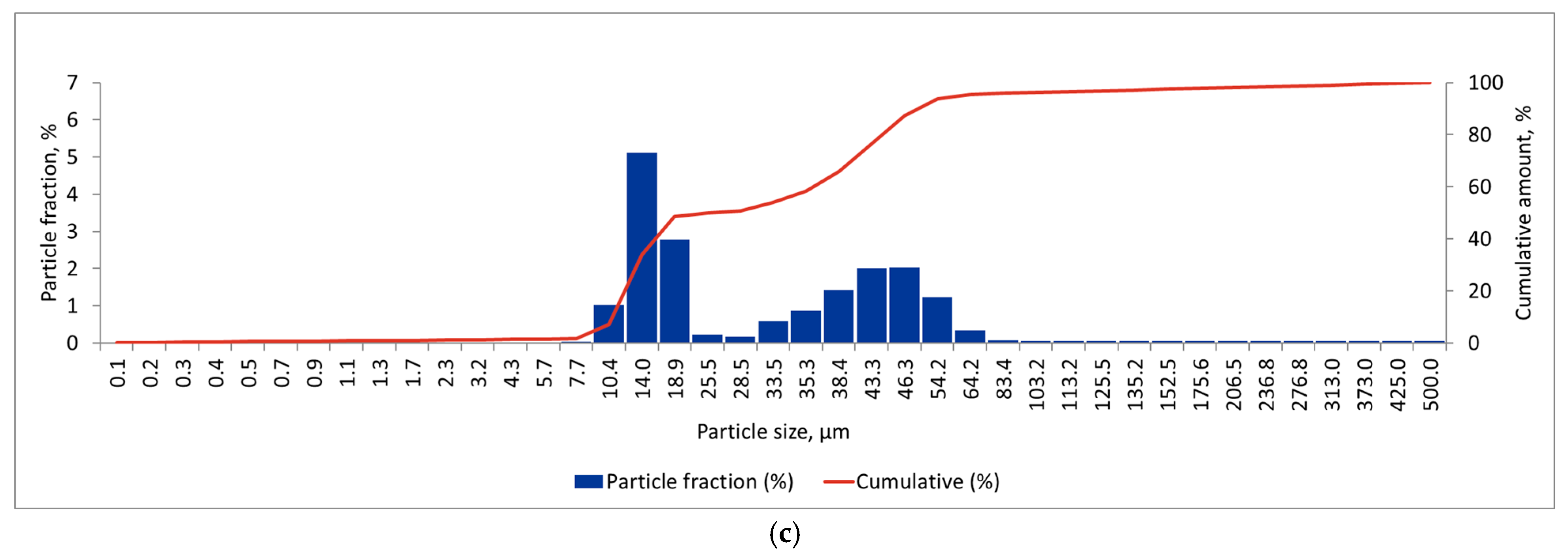 Table 3, the reference samples milled without additives exhibited the longest grinding durations. Rock wool required the highest energy input, reaching the target particle size mode below 50 µm only after 35 min of milling. Glass wool and mixed wool achieved the same particle size in 30 and 28 min, respectively. These values reflect the intrinsic differences in fiber composition and mechanical resistance among the tested wool types.