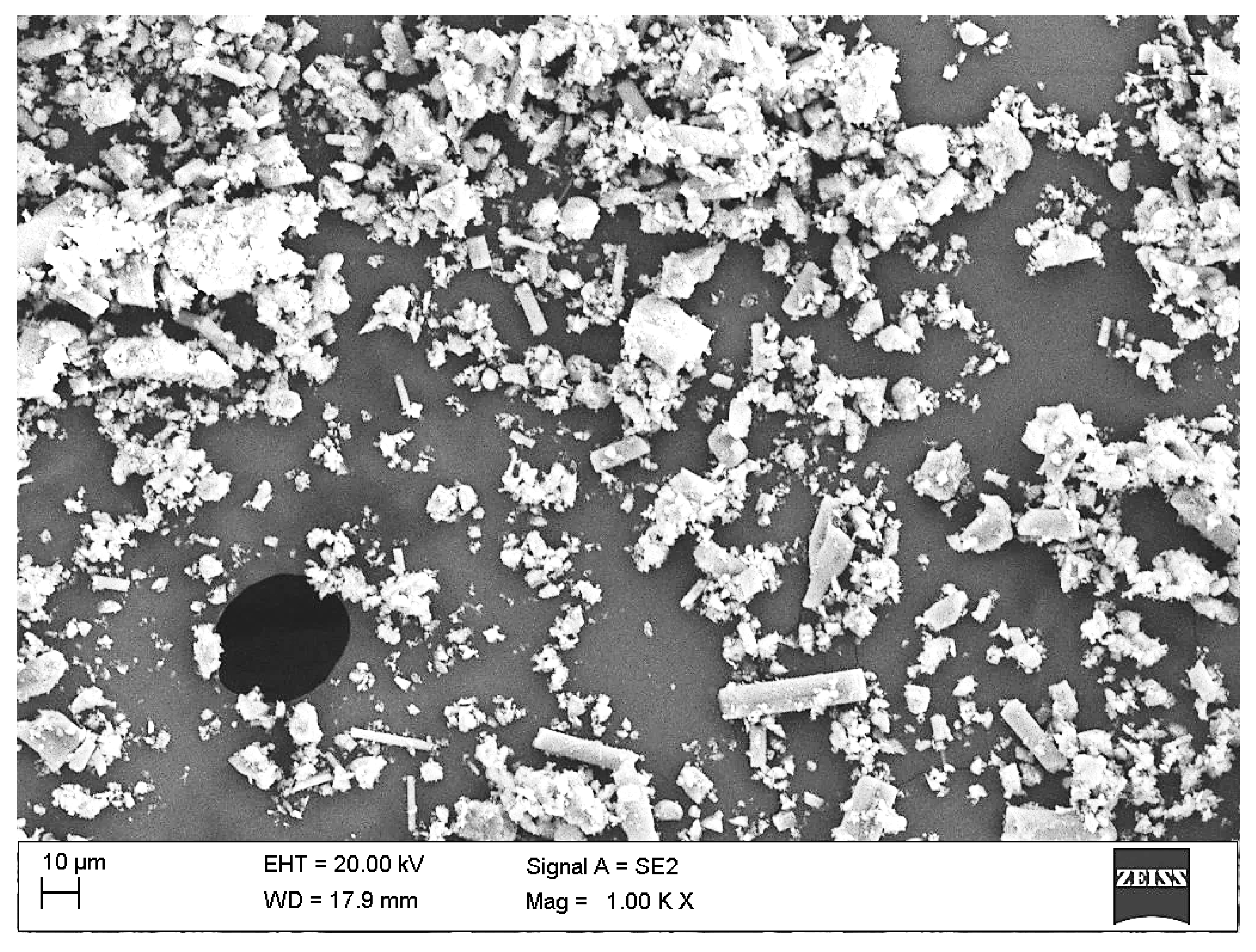 The results of the conducted experiments confirmed that the use of hard mineral additives significantly improves the grinding efficiency of mineral wool waste. The efficiency of the process was assessed based on three key indicators: total milling time required to achieve the target fineness, particle size distribution, and morphological changes observed in the material after grinding.