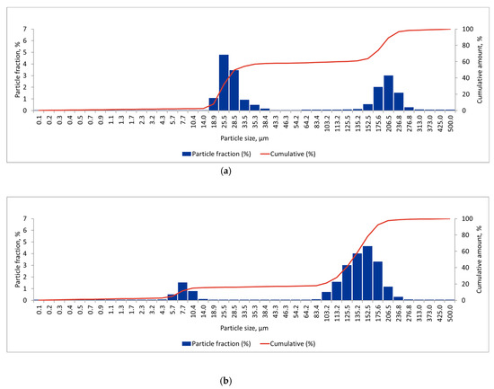 The particle size distribution curves presented in Figure 3 illustrate the baseline grinding behavior of glass wool (GW-REF), rock wool (RW-REF), and mixed wool (MW-REF) in the absence of any additives. All three materials exhibit wide, asymmetric distribution profiles, with modes above 50 µm and long right-side tails, indicating the presence of unbroken fibers and coarse agglomerates. The rock wool sample shows the broadest span and coarsest mode, confirming its higher resistance to grinding. These reference curves provide a benchmark for evaluating the efficiency of additive-assisted milling.