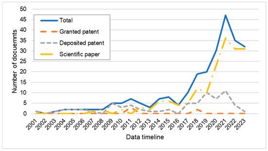 The 307 documents were systematically analyzed following the methodology detailed in Section 2.3, with their full description provided in the database presented in Table S1. The subsequent sections provide a comprehensive description of the distinct analytical approaches employed, encompassing macro-, meso-, and micro-level evaluations, which together enable a multi-dimensional understanding of the technological landscape related to açaí waste valorization.