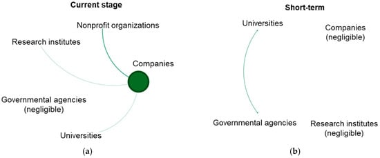 Type of players and their interconnections according to the time scale: (a) Current stage; (b) short-term; (c) mid-term; (d) long-term.