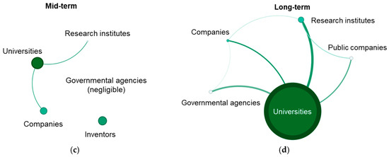 Figure 3 provides a clear and detailed depiction of the distribution and interaction patterns among different types of players across distinct time scales, each corresponding to a stage in the innovation process. In the context of scientific publications, which represent long-term innovation efforts and lower technology readiness levels (TRLs), universities emerge as the predominant players. These institutions not only produce most documents but also exhibit dense networks of collaborations both internally, through partnerships between universities, and externally, engaging with other player types such as companies and government agencies, although these appear in smaller numbers. This configuration underscores the role of academic institutions in driving early-stage research and fostering innovation opportunities with a long-term horizon.