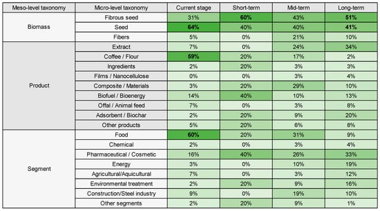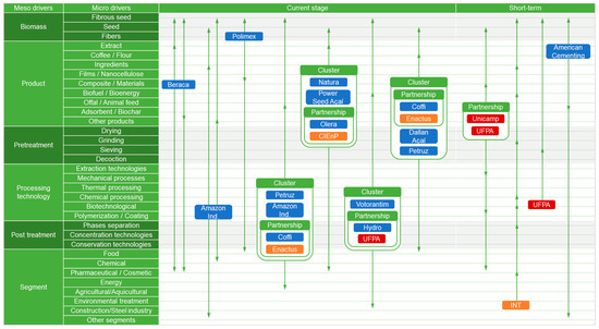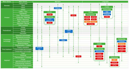 The refined dataset, systematically organized according to the technology roadmapping methodology, was distributed across four distinct temporal scales—current stage, short-term, mid-term, and long-term—to capture the evolution of technologies, products, and market dynamics associated with açaí waste valorization. The roadmap construction adhered to established knowledge management principles, facilitating a structured temporal organization of information, while enabling the visualization of inter-organizational networks and the identification of clusters of critical meso- and micro-level taxonomies.