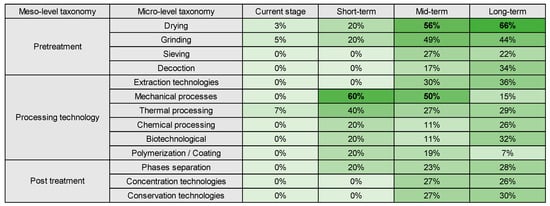 The valorization pathways for açaí waste were systematically categorized into meso and micro-level taxonomies, each corresponding to critical drivers of market dynamics, product typologies, and technological processes, as presented in Table 3. The meso-level taxonomies serve as overarching classifiers, delineating the thematic focus and clustering of the documents, whereas the micro-level taxonomies provide a granular dissection, enabling nuanced characterization of specific valorization strategies and technological approaches. The identification of these trends emerged from a rigorous data analysis process, which was instrumental in constructing the comprehensive technology roadmap.