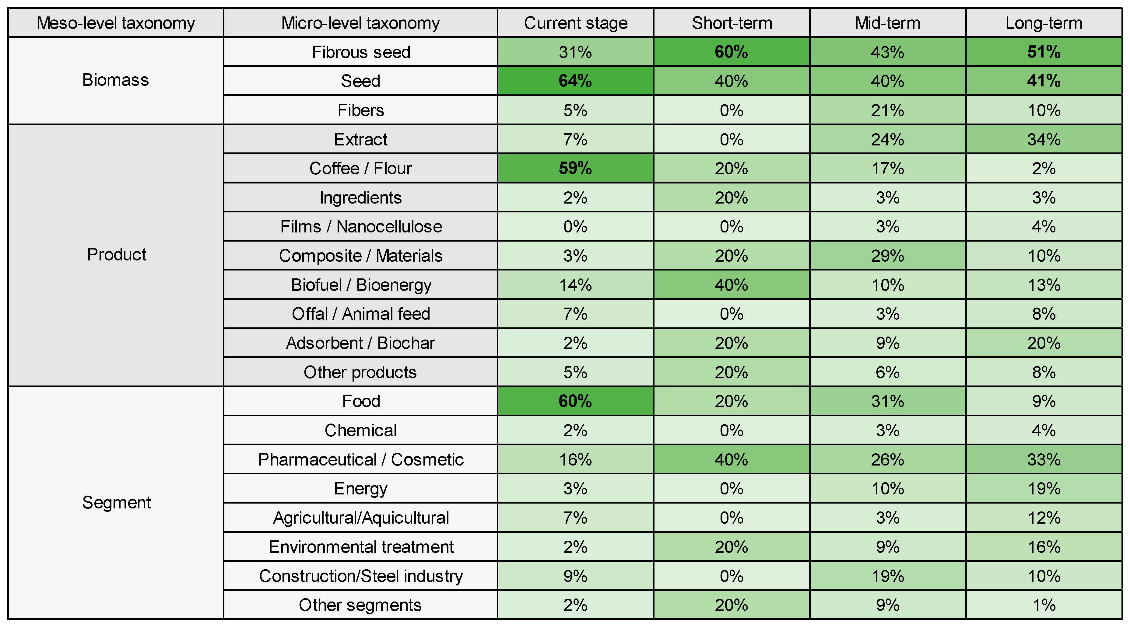 | Product | Product | Extract; coffee or flour; ingredients; films or nanocellulose; composite or materials; biofuel or bioenergy; offal or animal feed; adsorbent or biochar; other products |