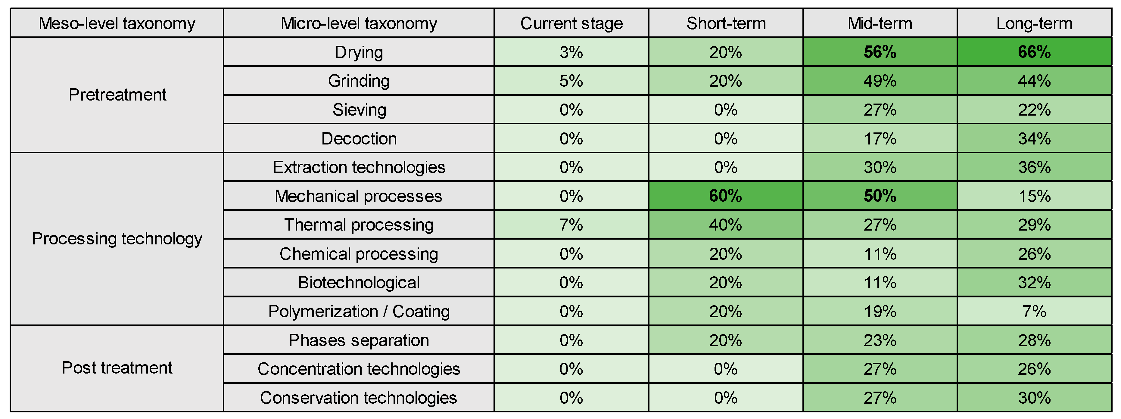 | Processing technology | Extraction technologies; mechanical processes; thermal processing; chemical processing; biotechnological; polymerization or coating | |