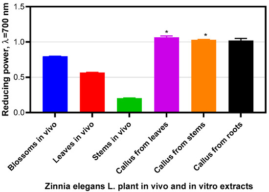Reducing (antioxidant) properties of Zinnia elegans L. plant extracts. The error bars show the mean ± SD from three replicates. Asterisks show statistically significant comparisons between Zinnia elegans L. plant in vivo extracts (from leaves and stems) and callus cultures (from leaves and stems) in vitro were tested with an unpaired two-tailed t-test, with a significance level set at * p < 0.01.