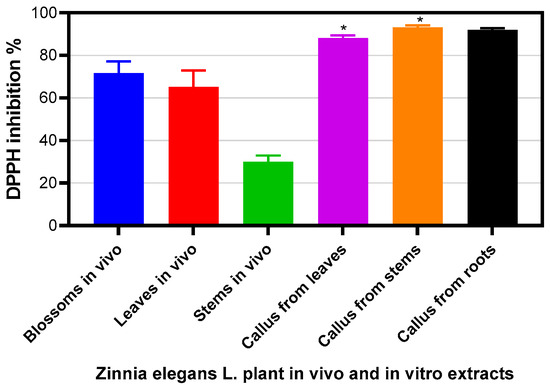 Antioxidative activity according to the DPPH assay of Zinnia elegans L. plant extracts. The error bars show the mean ± SD from three replicates. Asterisks show statistically significant comparisons between Zinnia elegans L. plant in vivo extracts (from leaves and stems) and callus cultures (from leaves and stems) in vitro were tested with an unpaired two-tailed t-test, with a significance level set at * p < 0.01.