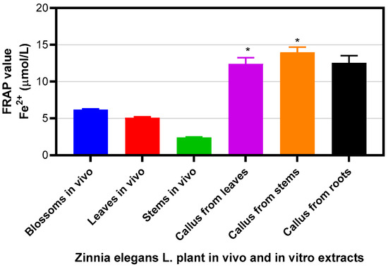 Antioxidative activity according to the FRAP method in Zinnia elegans L. plant extracts. The error bars show the mean ± SD from three replicates. Asterisks show statistically significant comparisons between Zinnia elegans L. plant in vivo extracts (from leaves and stems) and callus cultures (from leaves and stems) in vitro were tested with an unpaired two-tailed t-test, with a significance level set at * p < 0.01.