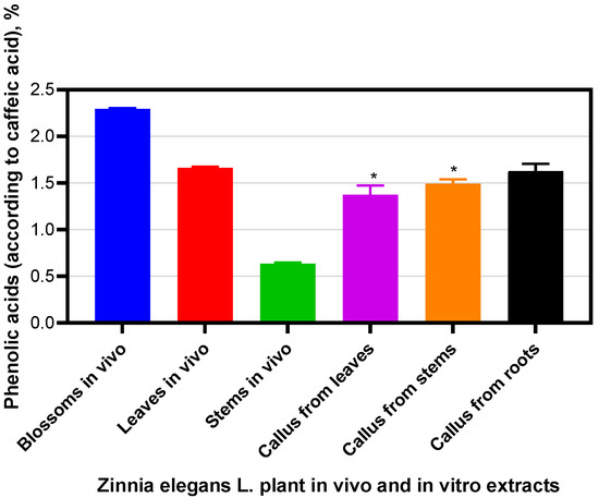 Phenolic acid concentration in plant extracts of Zinnia elegans L. The error bars show the mean ± SD from three replicates. Asterisks show statistically significant comparisons between Zinnia elegans L. plant in vivo extracts (from leaves and stems) and callus cultures (from leaves and stems) in vitro were tested with an unpaired two-tailed t-test, with a significance level set at * p < 0.01.